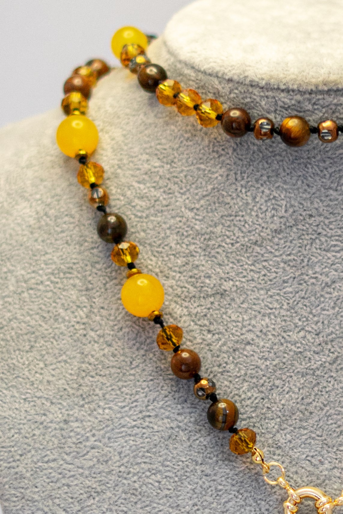 | Materiales Cuentas | Ojo de tigre con cuarzo rutilado, hematitas y ágatas amarillas. Broche enchapado en oro |