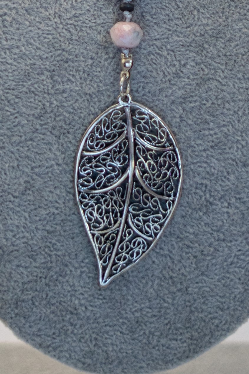 El dije de hoja plateada aporta un detalle natural y delicado que realza la composición, perfecta para quienes buscan un accesorio con carácter y elegancia.