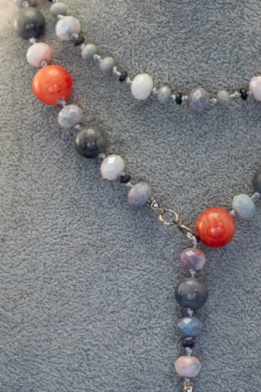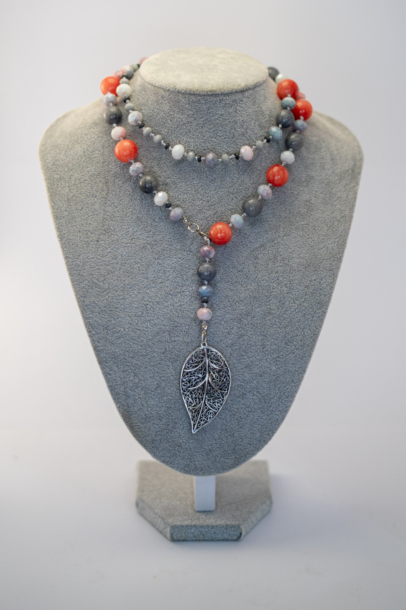 El Collar Ónix y Hoja une la fuerza y profundidad del ónix en tonos grises y naranjo con el brillo iridiscente de cristales tornasoles, creando una pieza equilibrada y única.