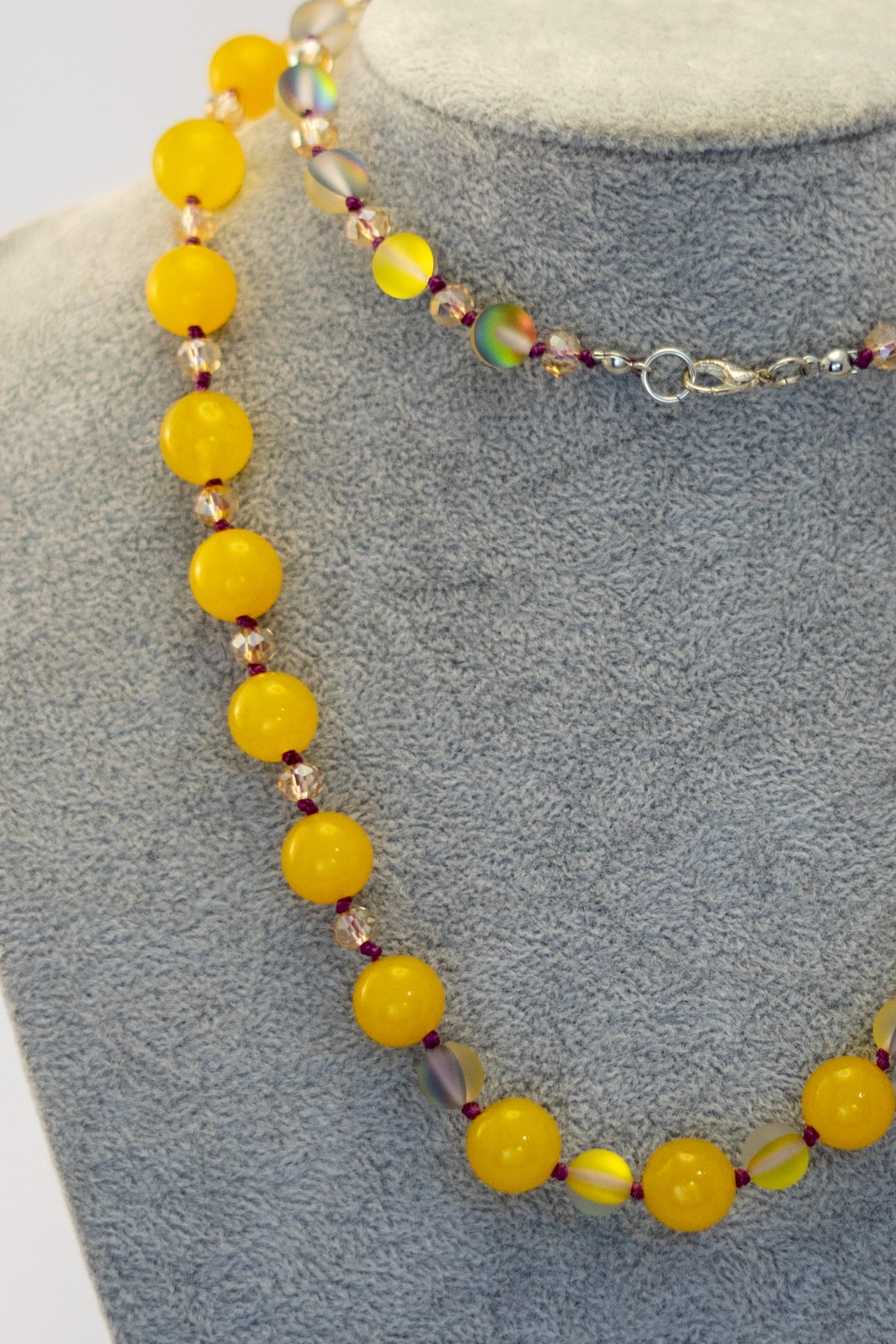 El Collar Aragonita es una pieza radiante que combina el brillo único de la aragonita con la suavidad del cuarzo sirena y cristales en variados tonos amarillos.