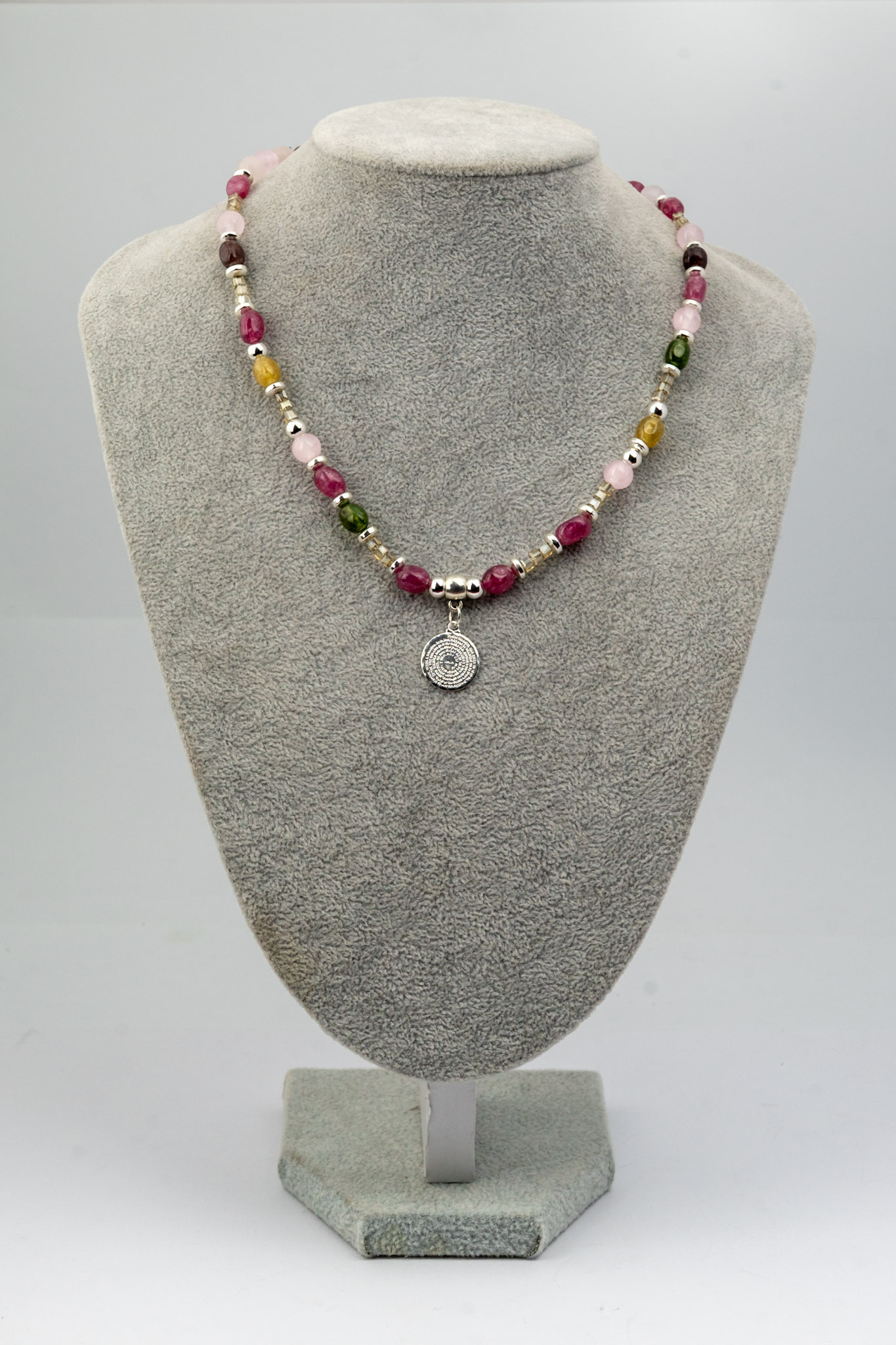 Collar Padre Nuestro elaborado con turmalina en tonos multicolor, combinado con delicados cristales que aportan brillo y elegancia. Los separadores y broches enchapados en plata completan la pieza, otorgándole un acabado sofisticado y duradero. Una joya artesanal ideal para quienes buscan un accesorio significativo y con estilo único.