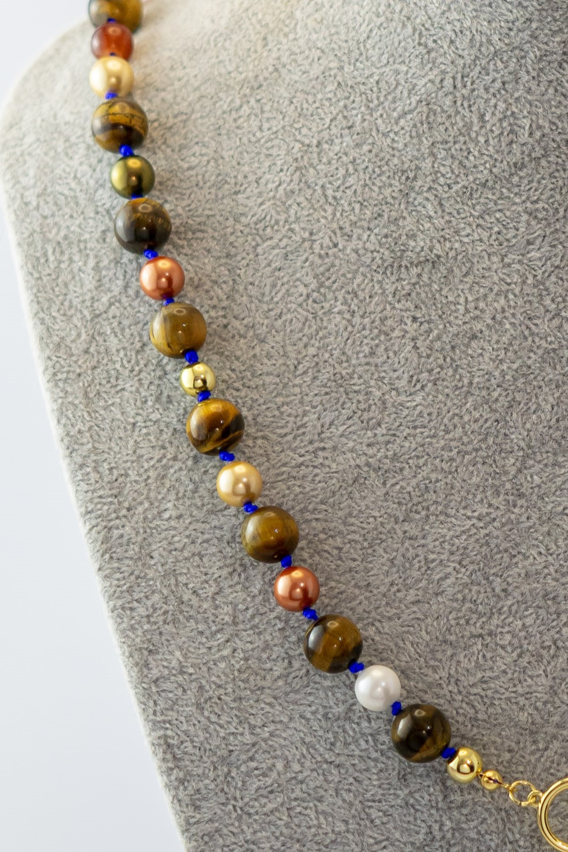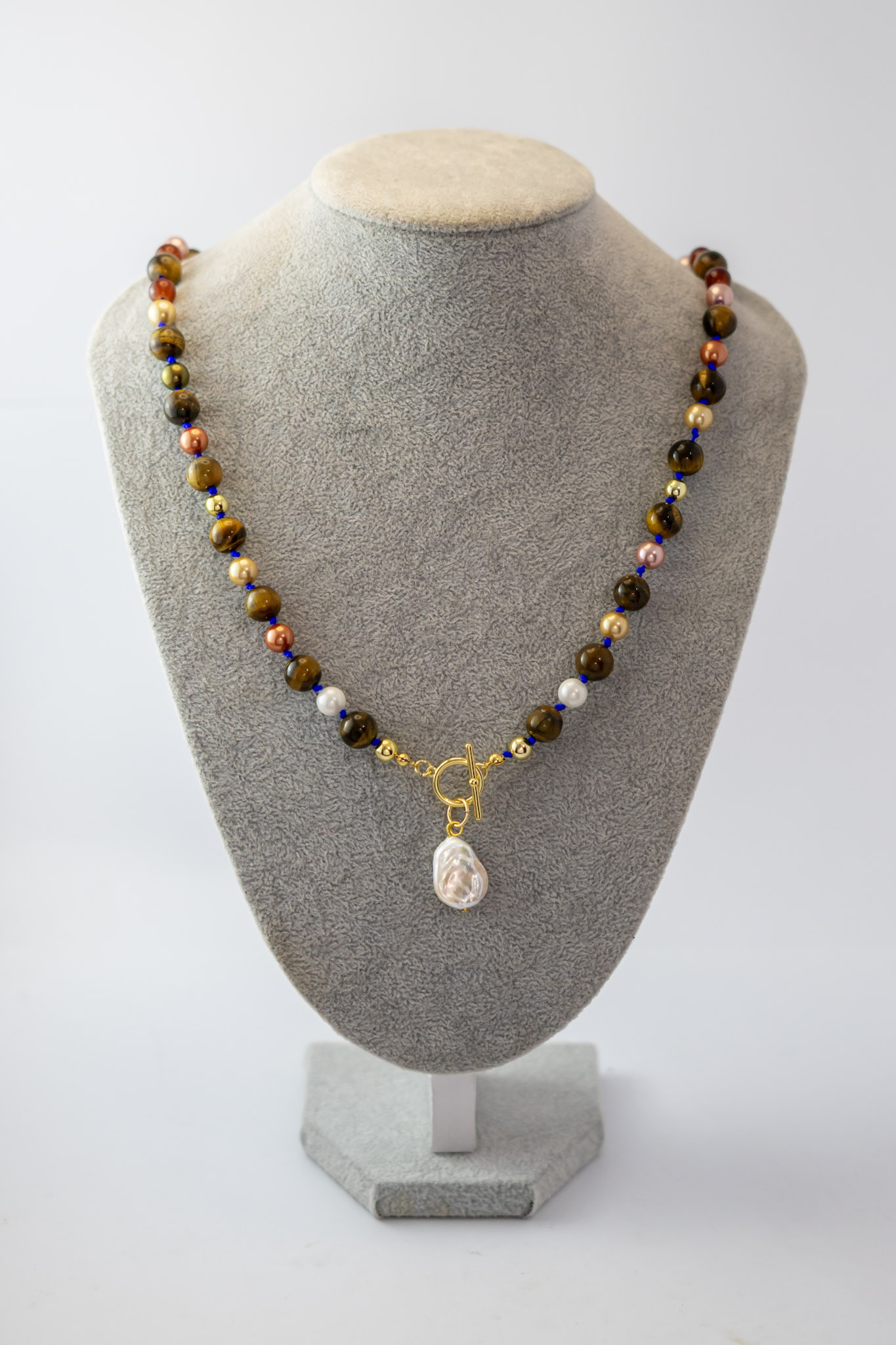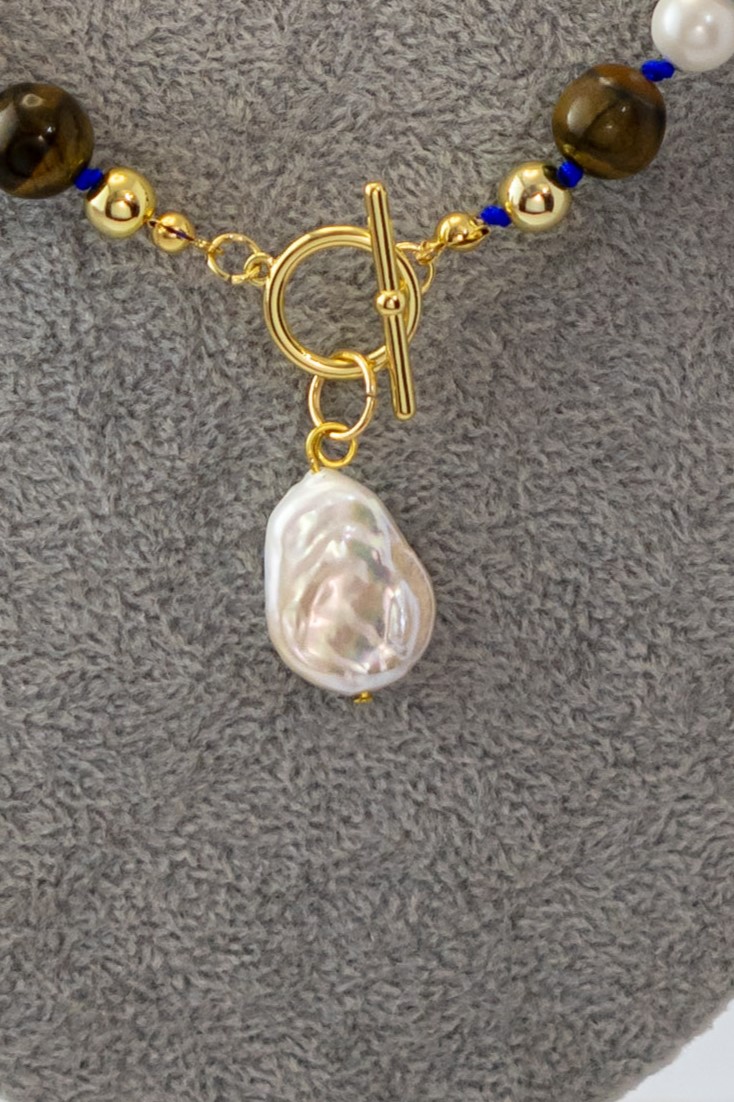 El Collar Perla Barroca destaca por su elegante combinación de tonos cálidos y texturas naturales. Su protagonista es una perla barroca, de forma orgánica y carácter único, acompañada por el brillo terroso del ojo de tigre, la suavidad de las perlas shell y la profundidad de las ágatas café.