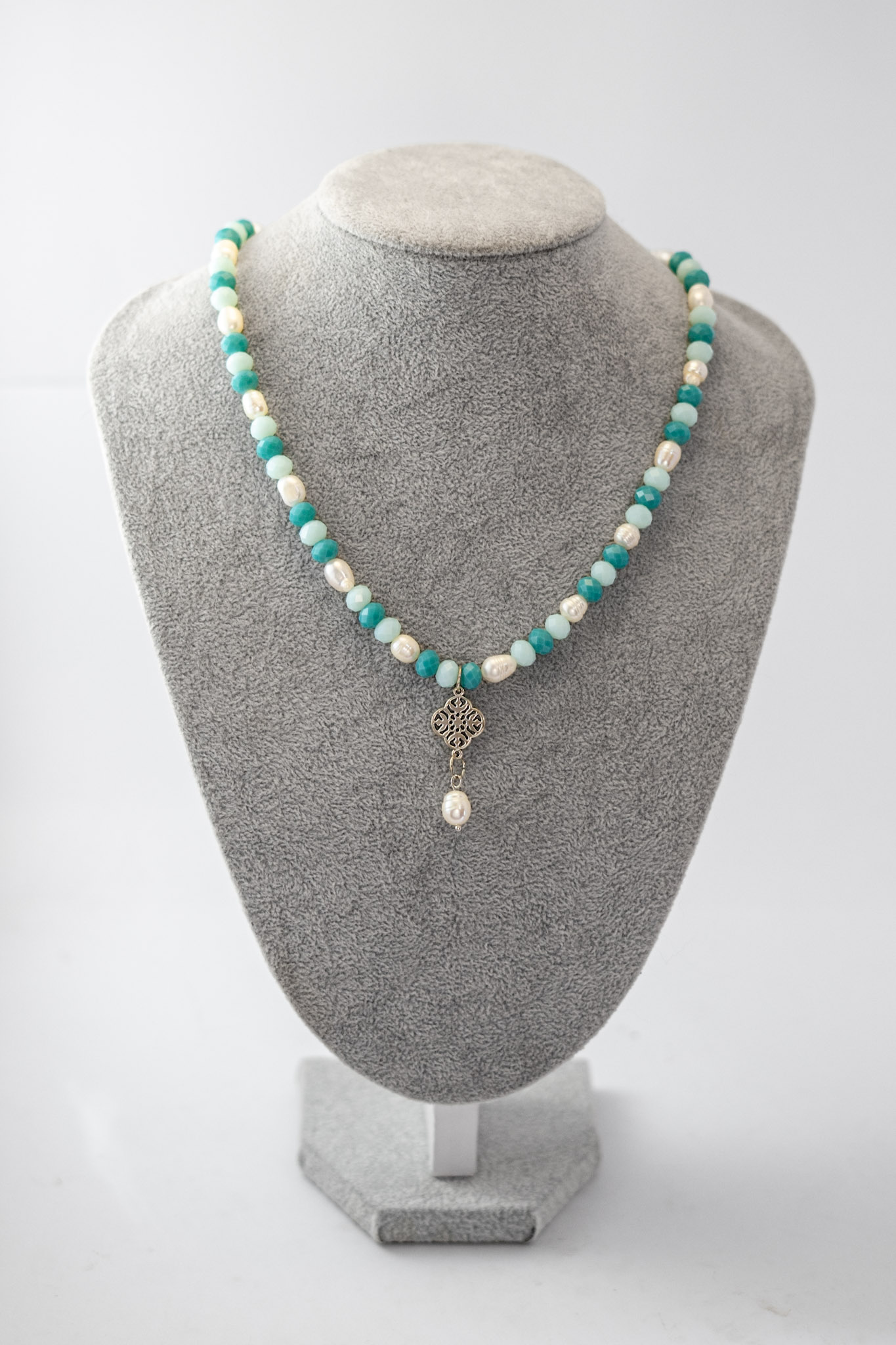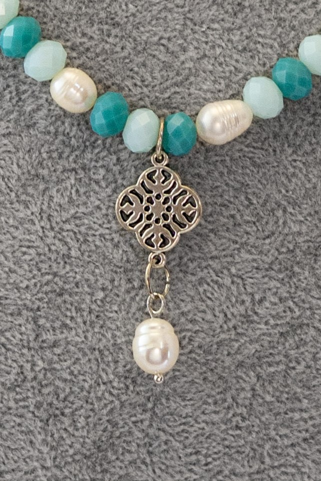 El Collar Perla Celeste combina la frescura del color celeste con la atemporalidad de las perlas de río, creando una pieza delicada y luminosa. Los cristales en tonos celeste aportan un sutil brillo que realza la suavidad del diseño, evocando serenidad y equilibrio.