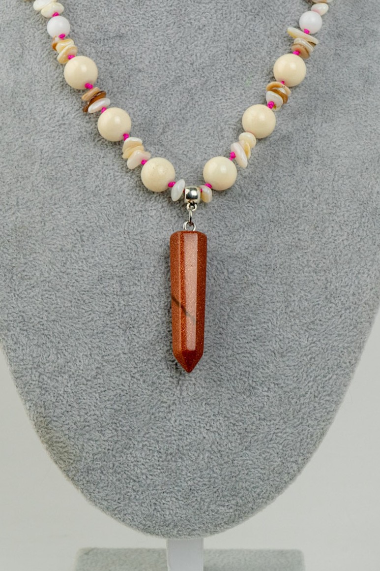 Este elegante collar combina un llamativo péndulo de piedra del sol, símbolo de energía y vitalidad, con la pureza del ónix blanco en chips y esferas, creando un contraste armonioso y sofisticado. Su diseño equilibra movimiento y textura, aportando un estilo moderno y distintivo. El broche enchapado en plata entrega un acabado refinado y seguro, ideal para complementar cualquier look con personalidad.