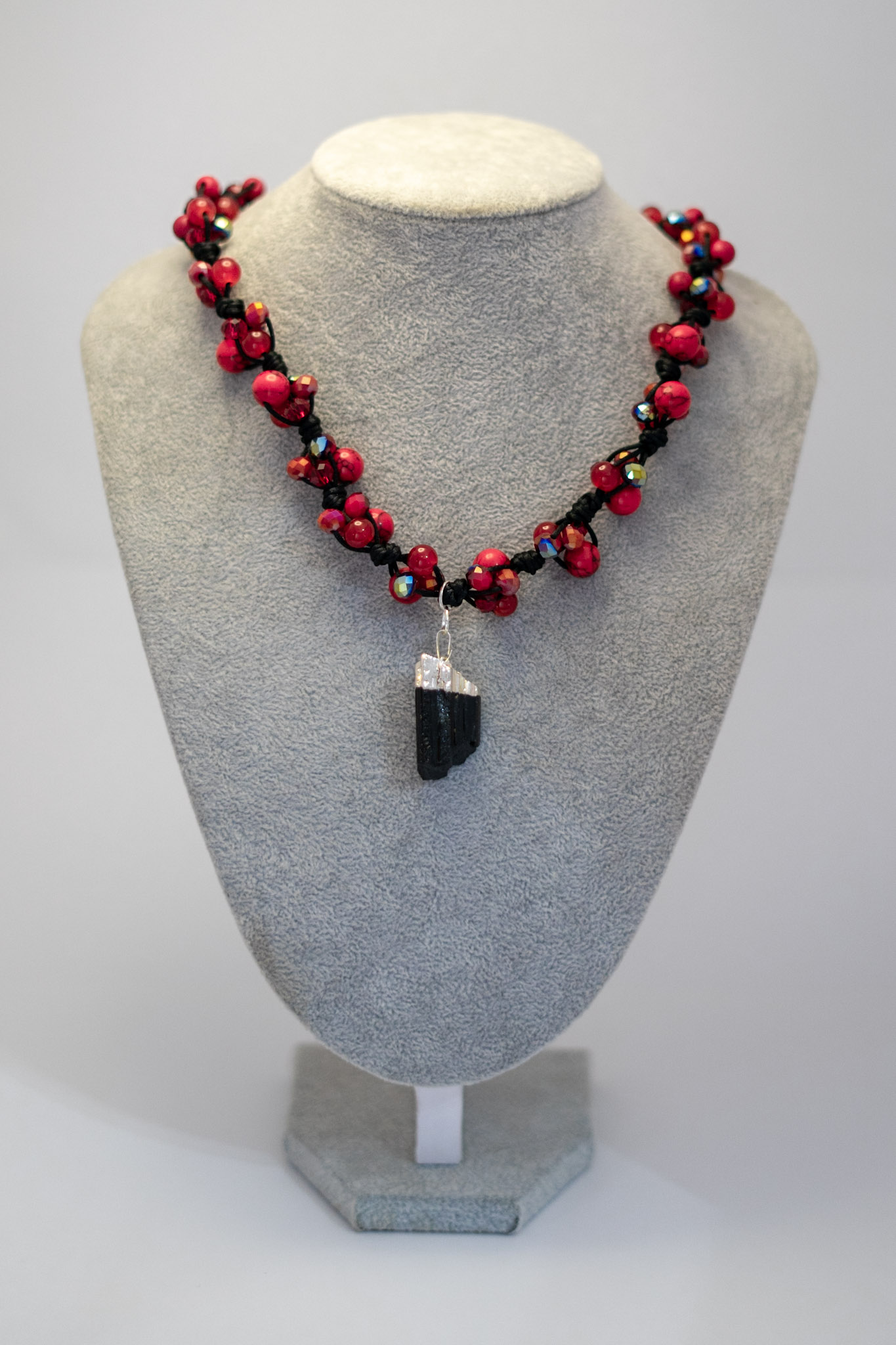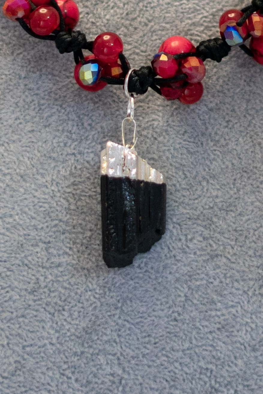 Este elegante collar combina la fuerza y el contraste de la turmalina negra con la vibrante energía de la howlita roja, realzada por delicados cristales facetados que aportan brillo y movimiento. Su diseño, inspirado en el estilo mexicano, evoca tradición y colorido, mientras que el broche plateado asegura un cierre cómodo y duradero. Ideal para quienes buscan una pieza única que destaque por su armonía de colores y materiales de alta calidad.