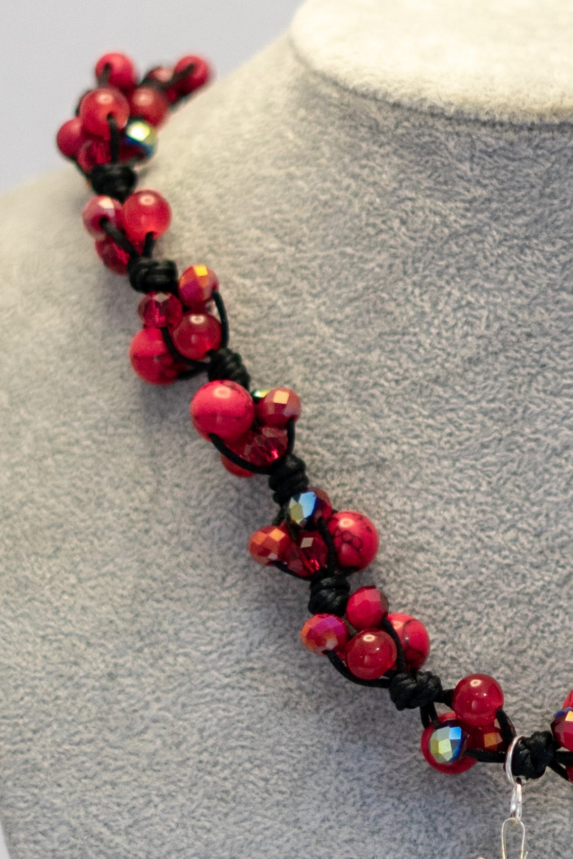 | Materiales Cuentas | Howlita roja con cristales facetados y broche plateado |