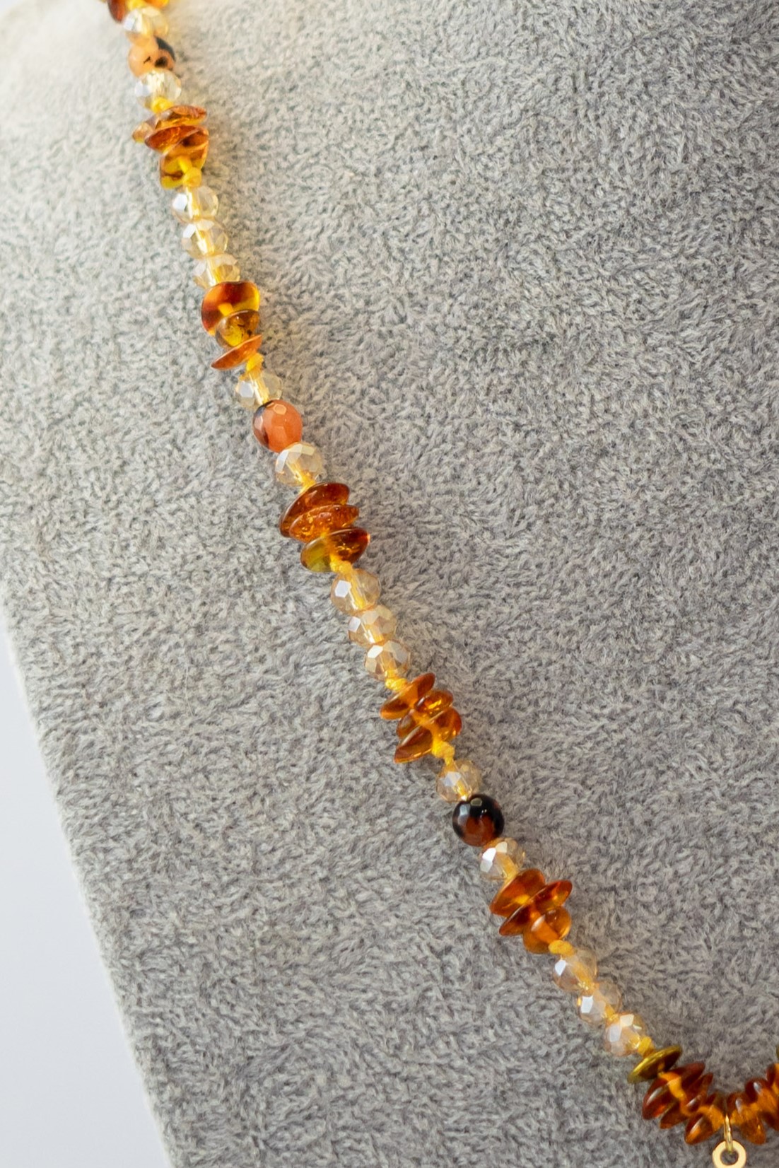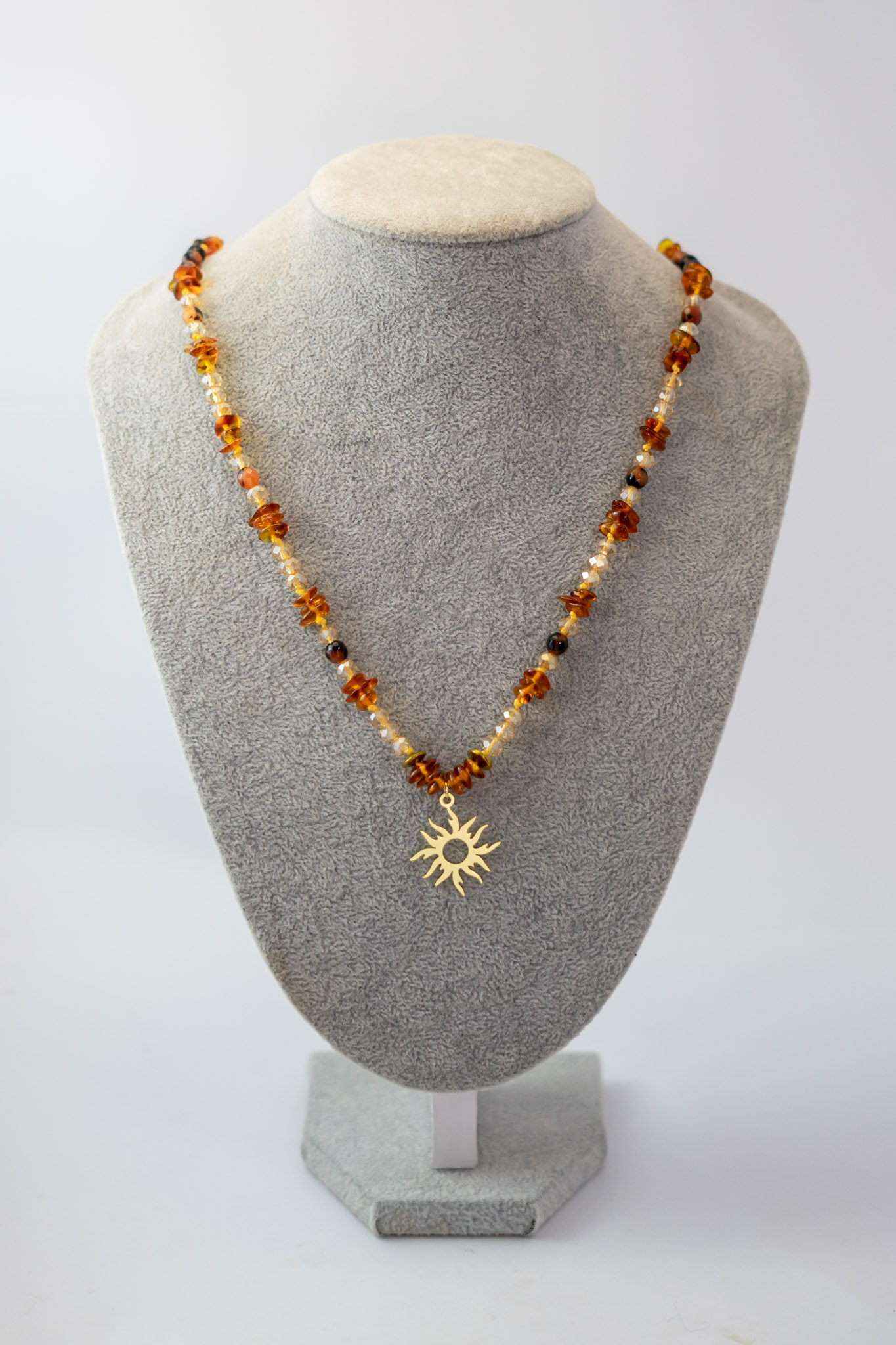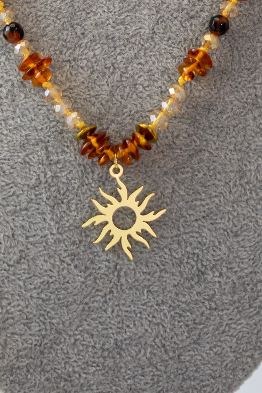 El Collar Sol Ámbar combina la calidez del ámbar con ágatas en tonos tierra y delicados cristales claros, en una composición que transmite luz y equilibrio. Su dije central en forma de sol enchapado en oro agrega un toque simbólico y luminoso, perfecto para quienes buscan una joya con energía positiva y estilo natural.