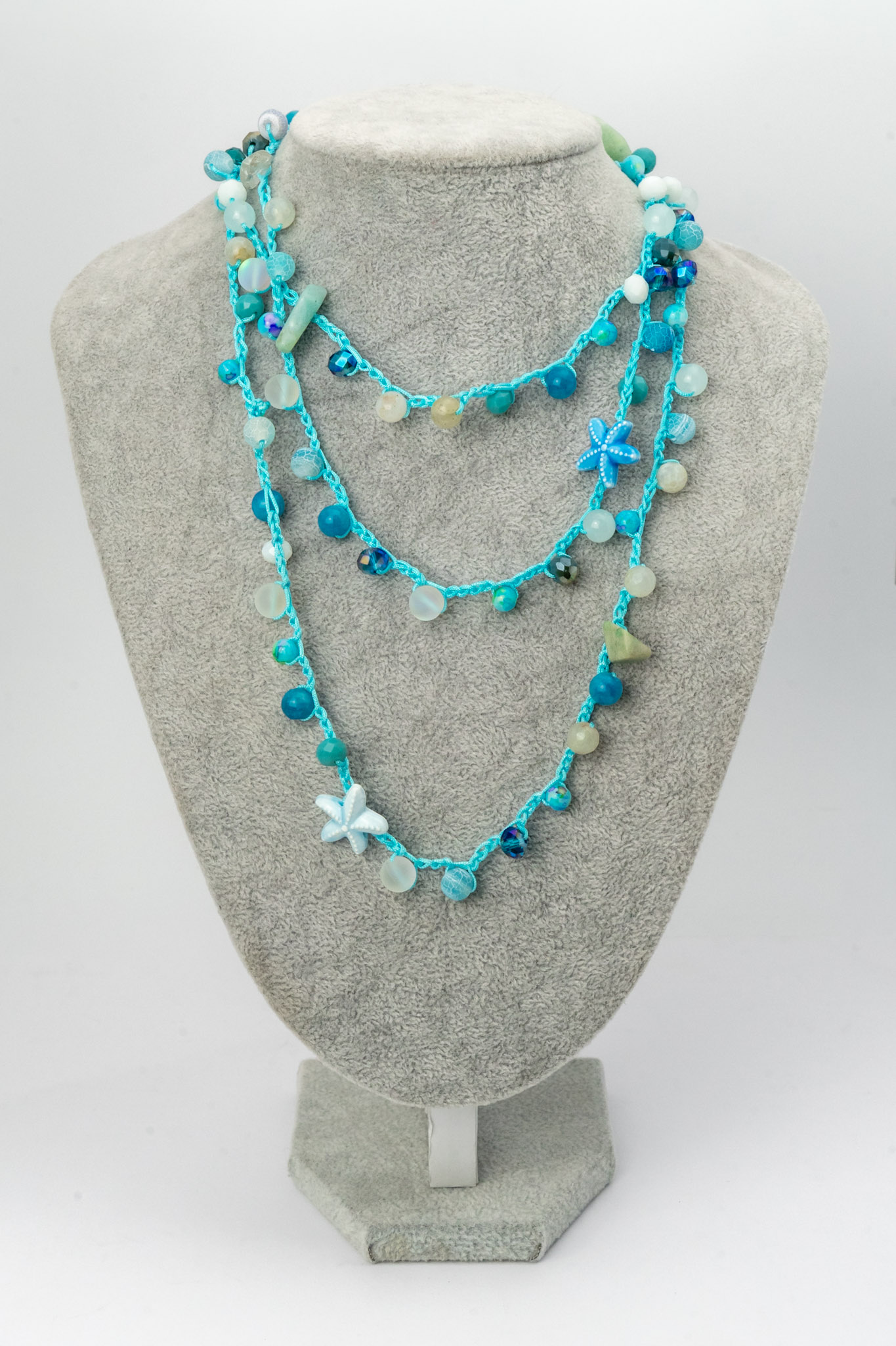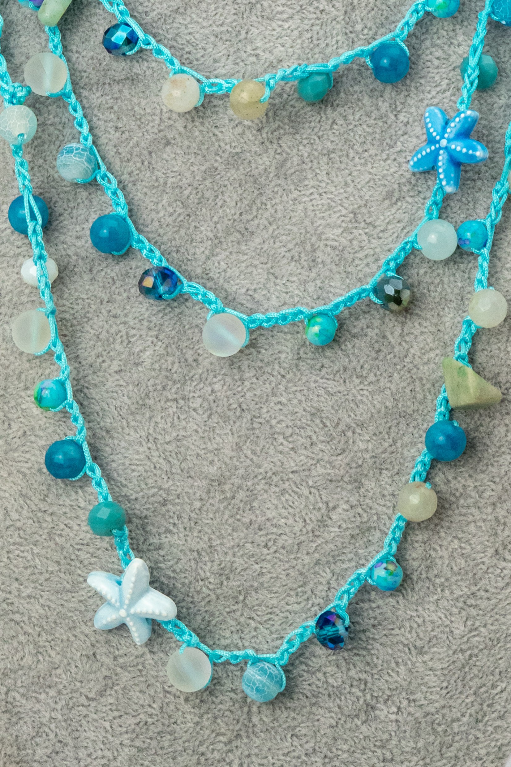 Inspirado en el mar y el cielo, este collar combina amazonita, cuarzo sirena, ágatas celestes, cuarzo cristal, estrellas de cerámica y cristales. Su gama de azules y blancos transmite calma y frescura. Ideal para quienes buscan un accesorio artesanal con energía serena y encanto natural.