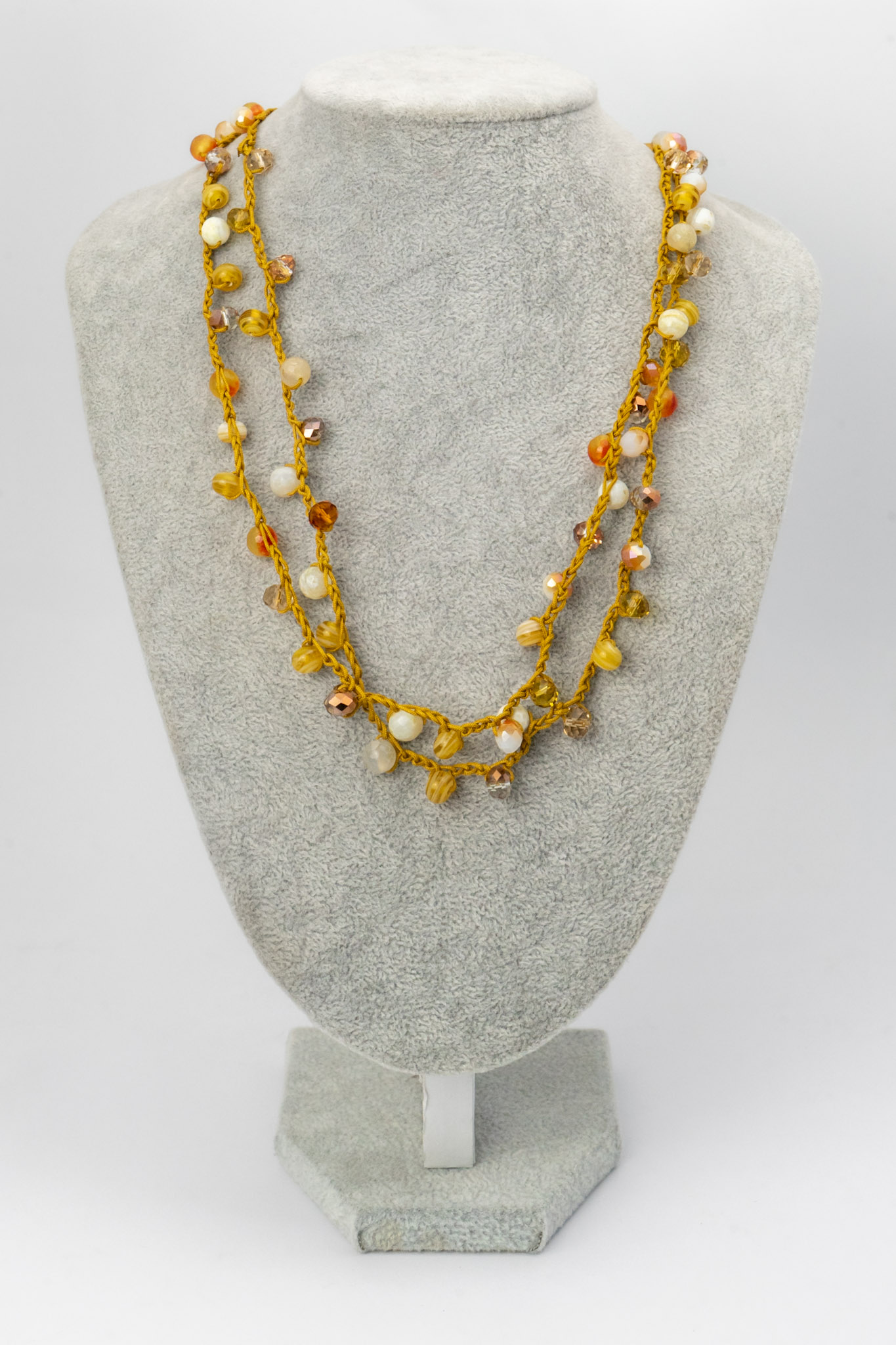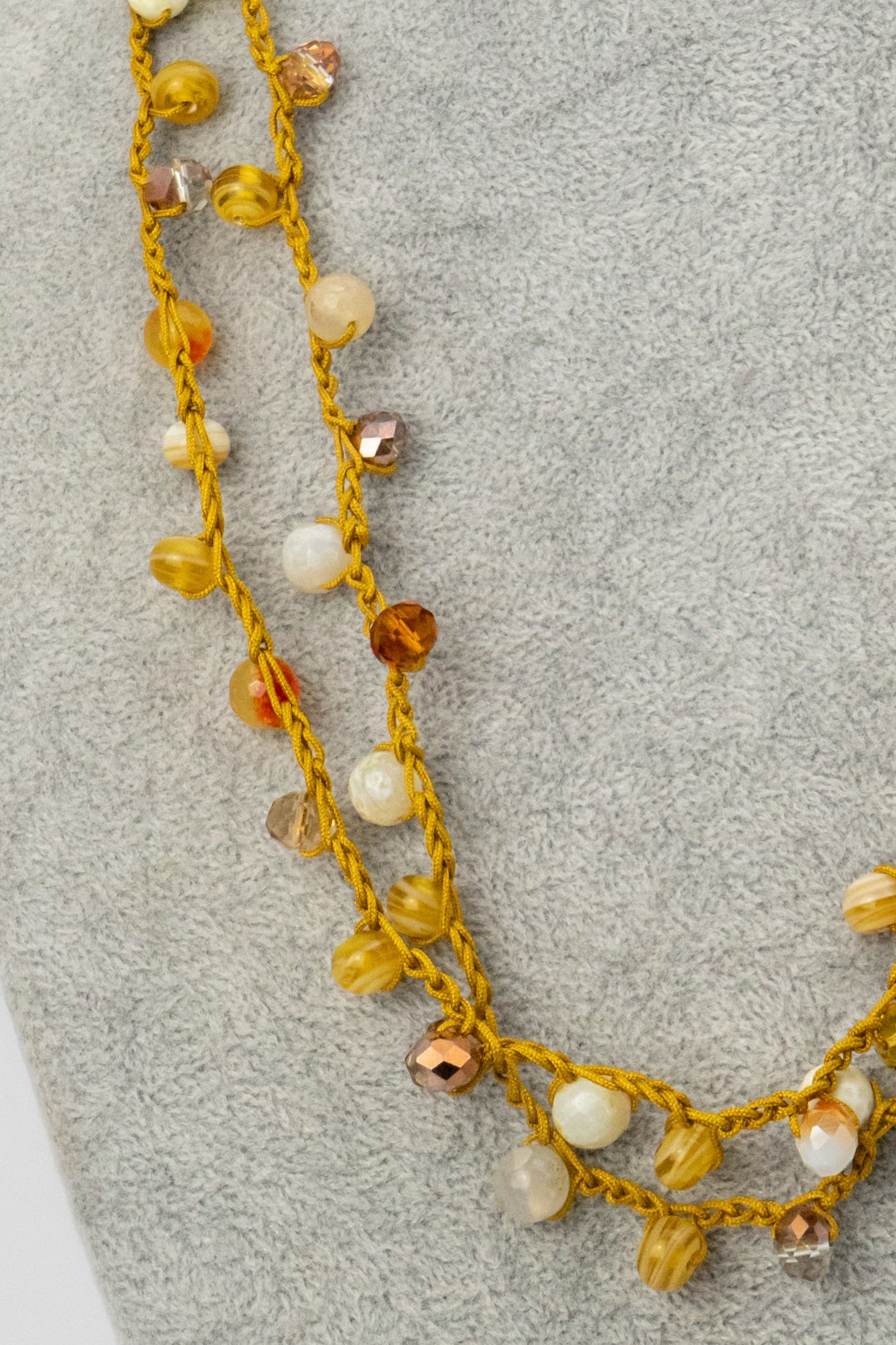 Este collar combina ágatas en tonos marfil y amarillo con cristales que reflejan la luz con suavidad. Su diseño tejido y artesanal evoca la calidez del sol y la elegancia del dorado. Una pieza luminosa que aporta alegría y sofisticación a cualquier estilo.
