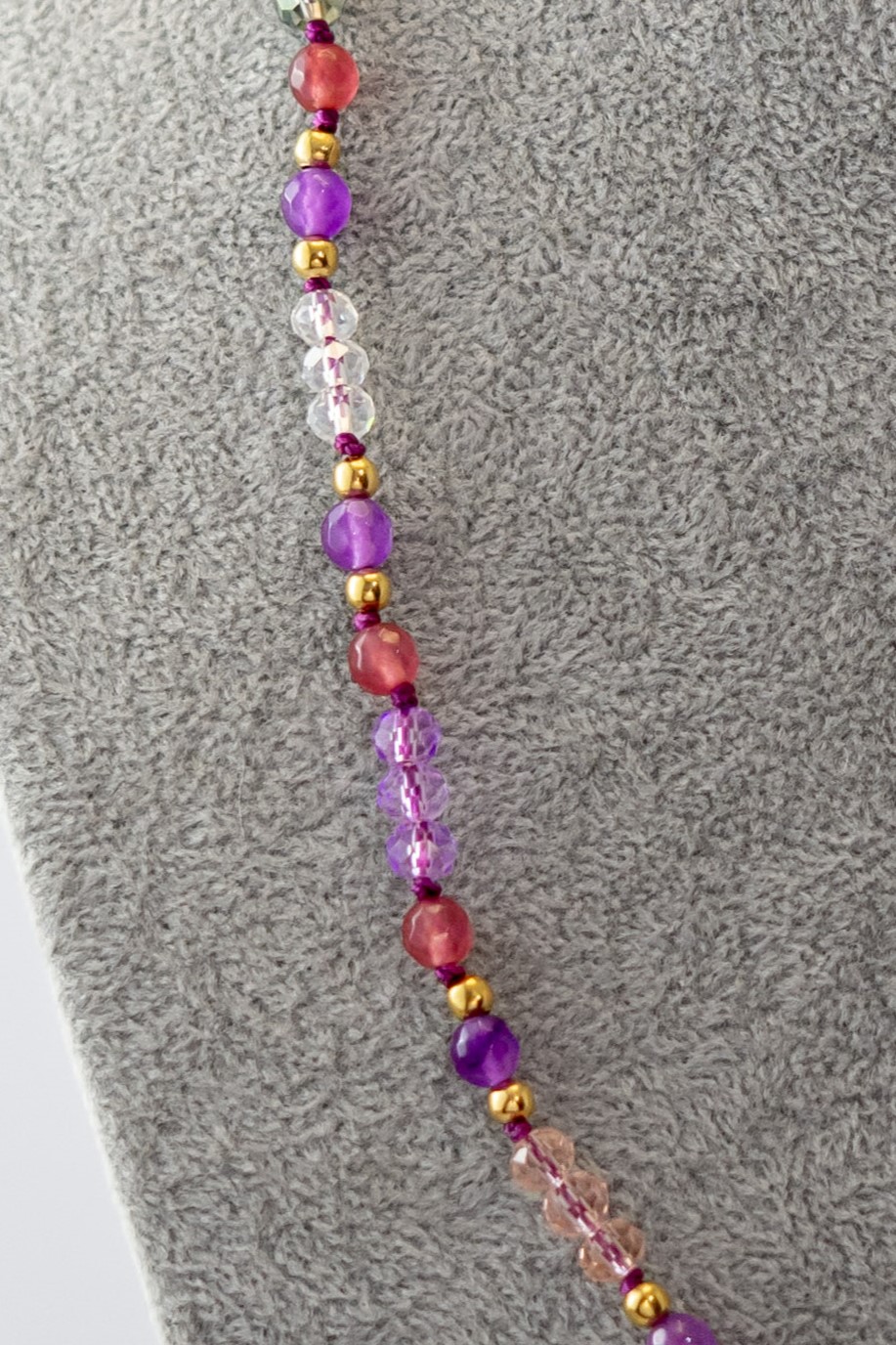 | Materiales Cuentas | Ágatas en tonos morados y rosa con cristales en tonos rosa, morados, y tornasol hematitas. |