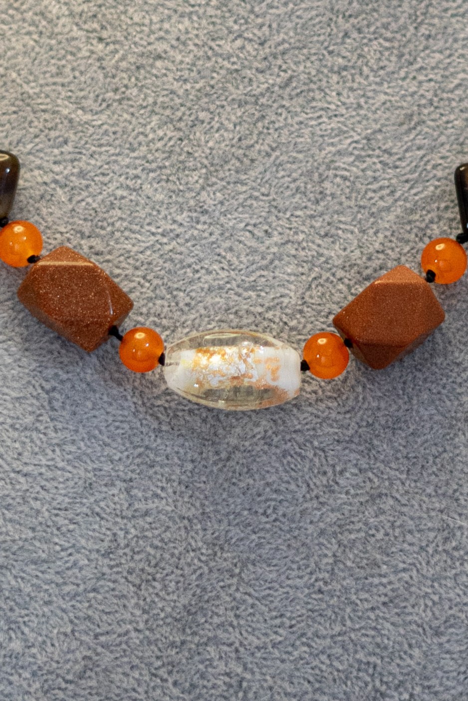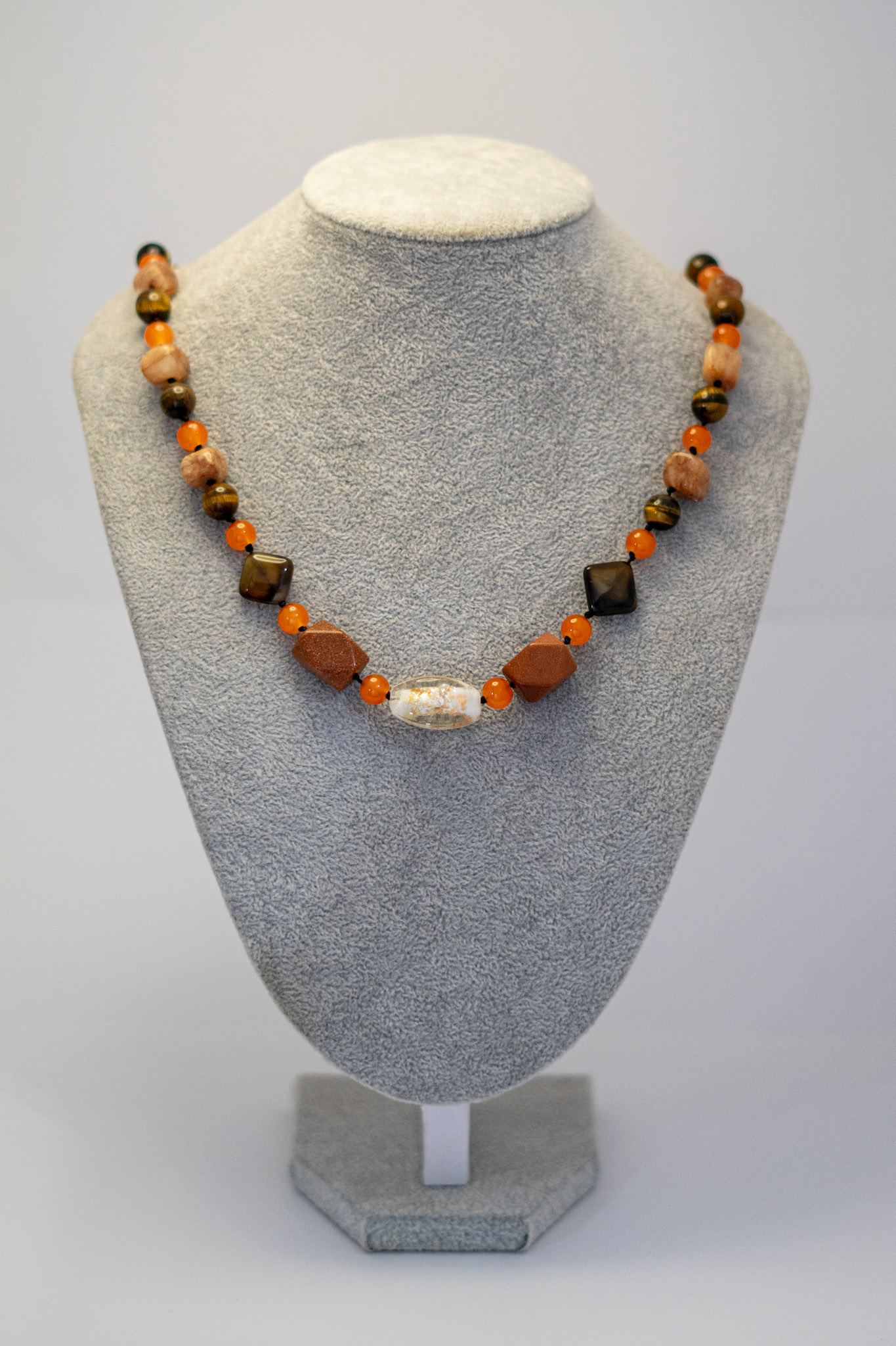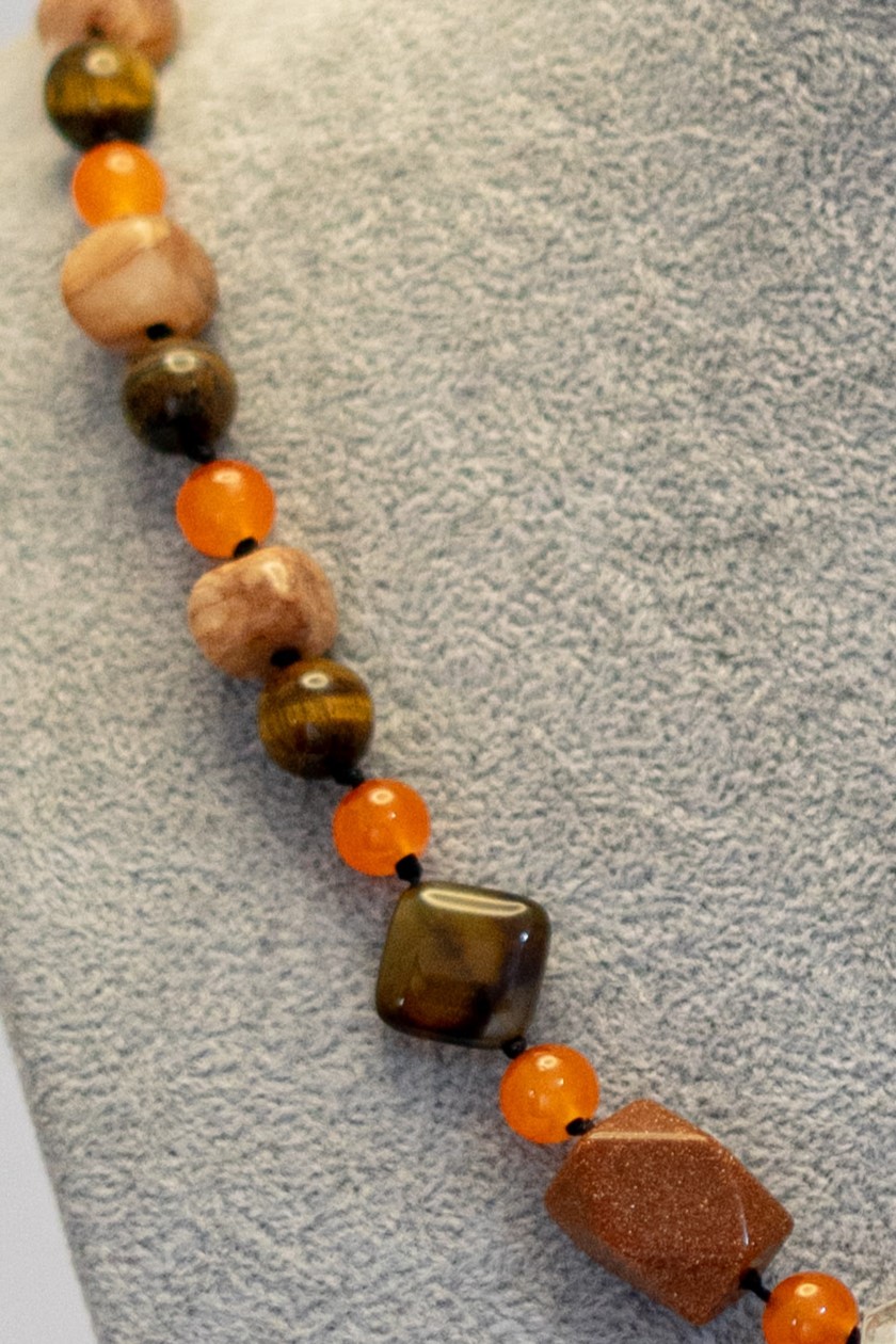 | Materiales Cuentas | Cristal hindú central. Ojo de trigre café con cuarzo, piedra del sol, jaspes café y ágatas naranja |