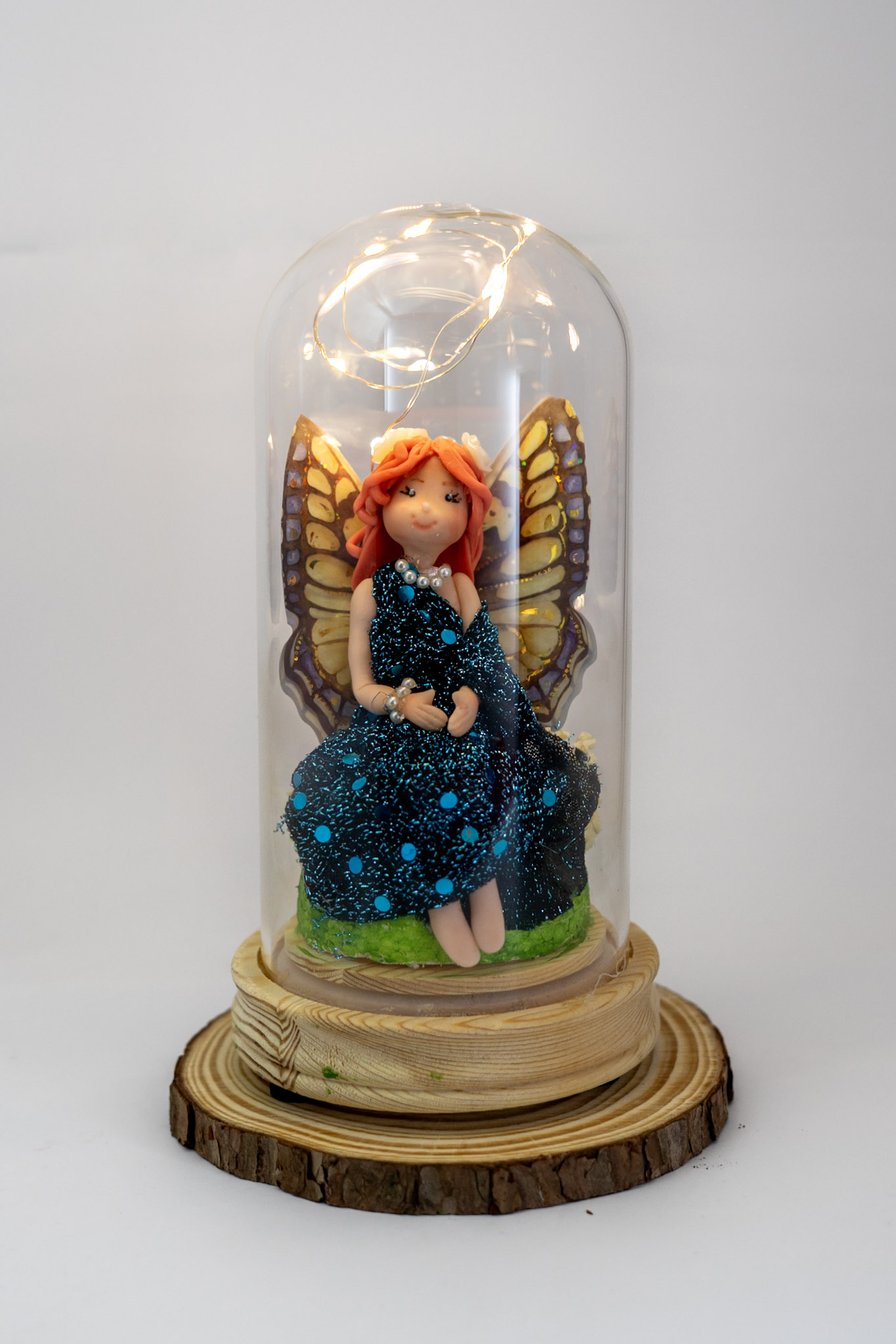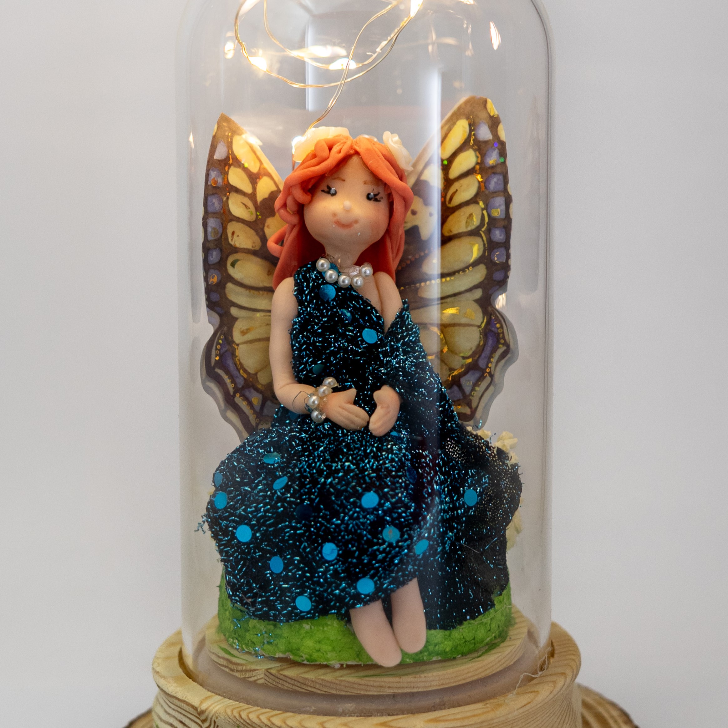 Encantadora figura de hada con delicadas alas de mariposa y vestido azul, elaborada completamente a mano con gran atención al detalle.