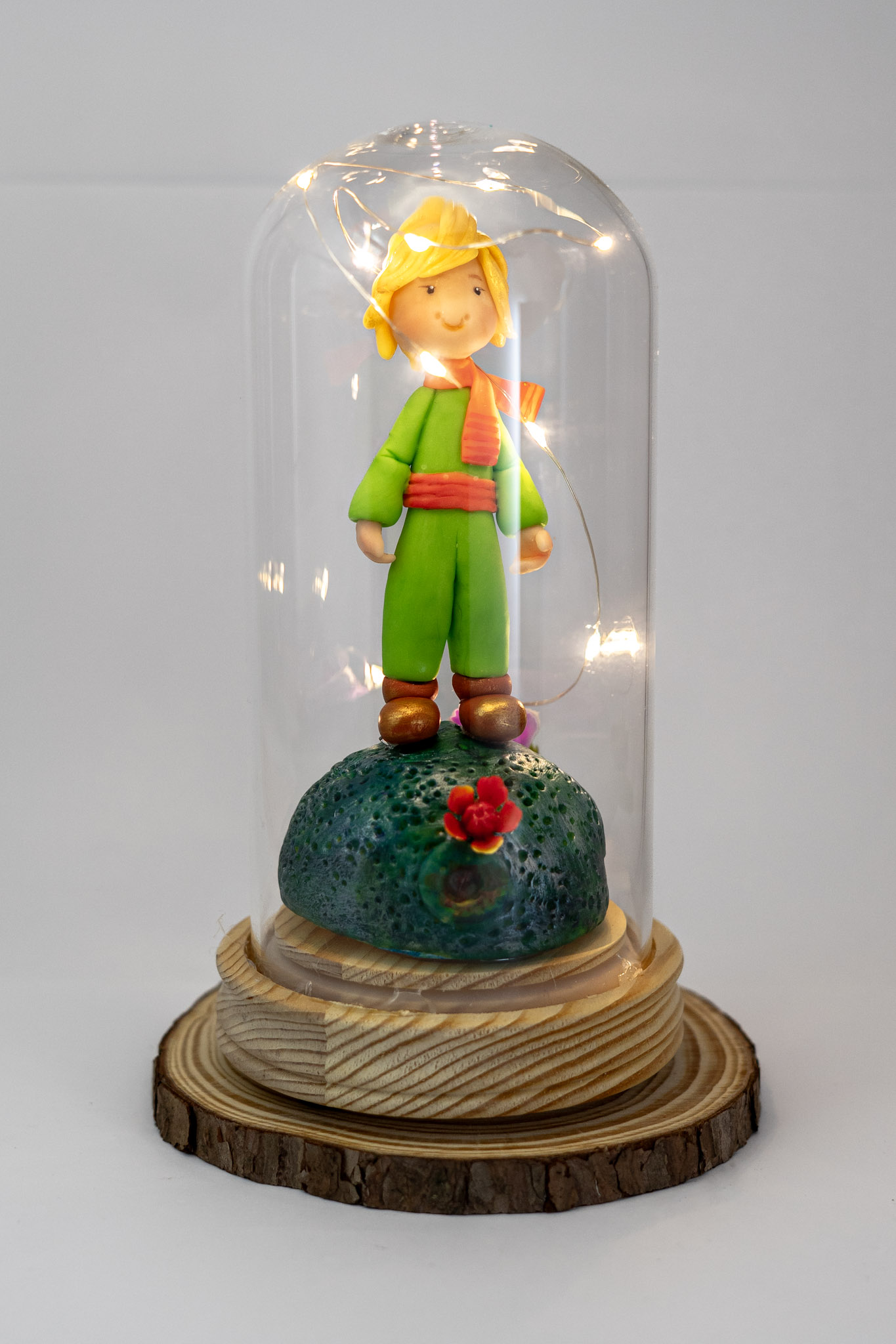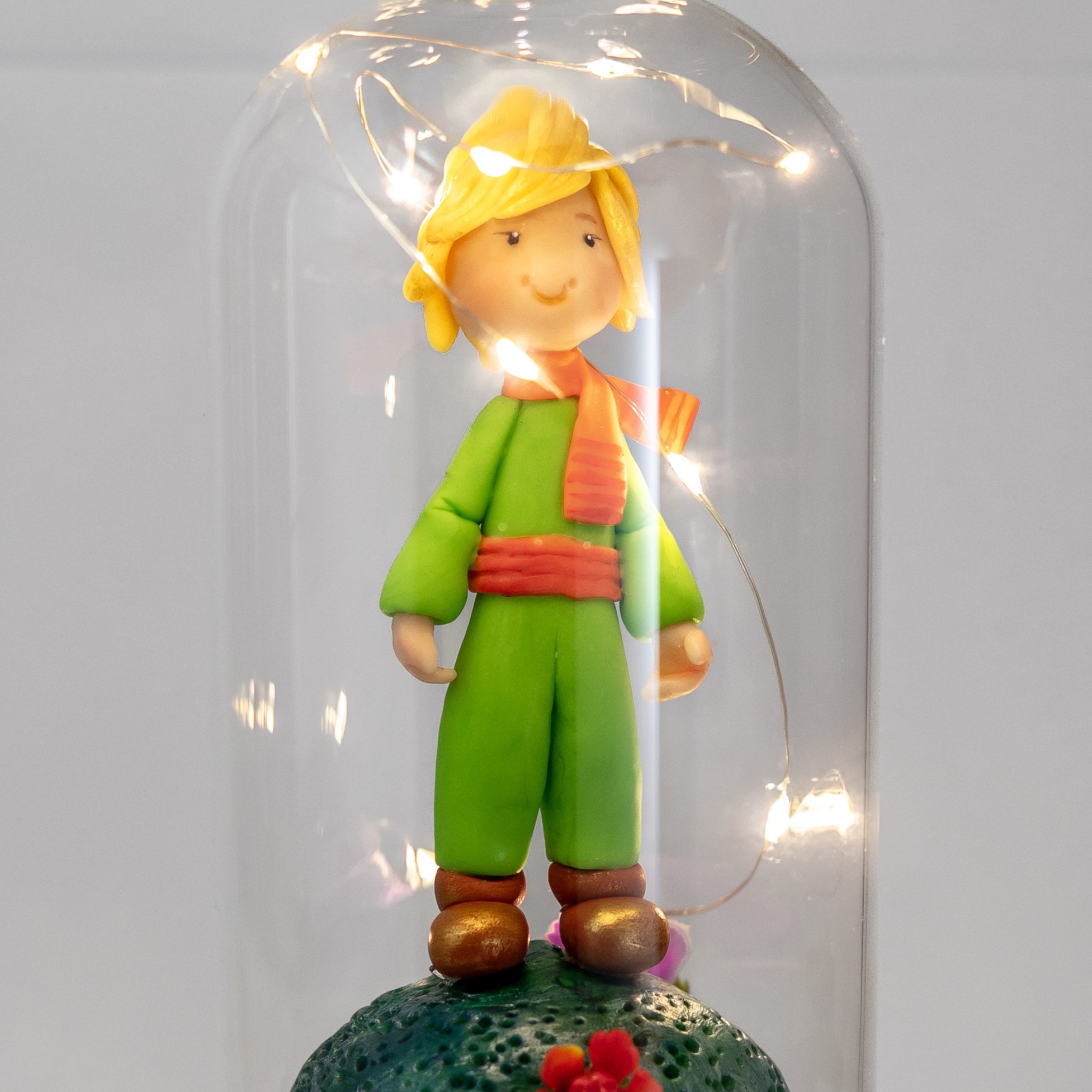 Esta exquisita miniatura del Principito, protegida por una elegante cúpula de cristal, captura la esencia poética del clásico literario. Con detalles finamente trabajados, el personaje aparece de pie sobre su pequeño planeta, evocando ternura, nostalgia y reflexión.
