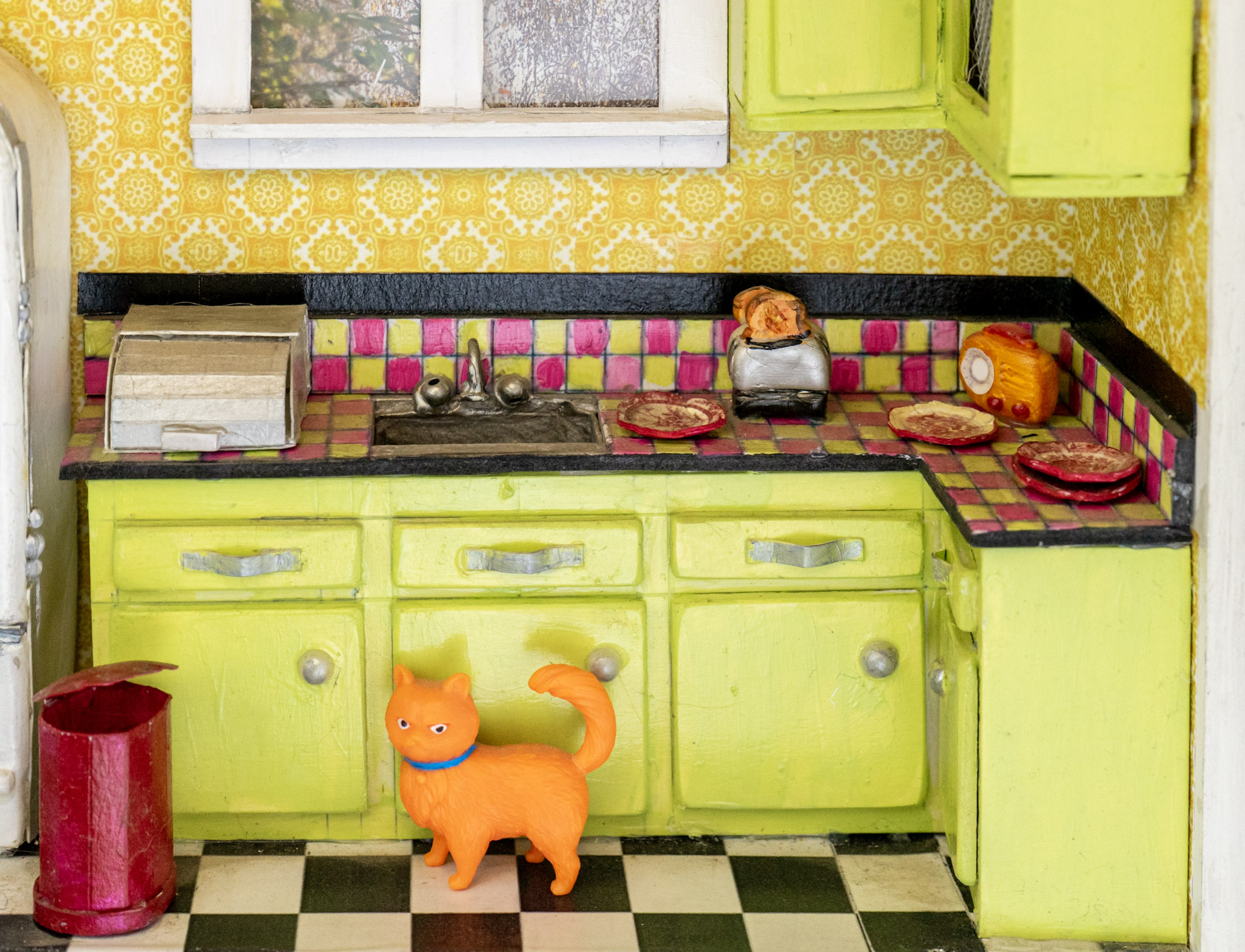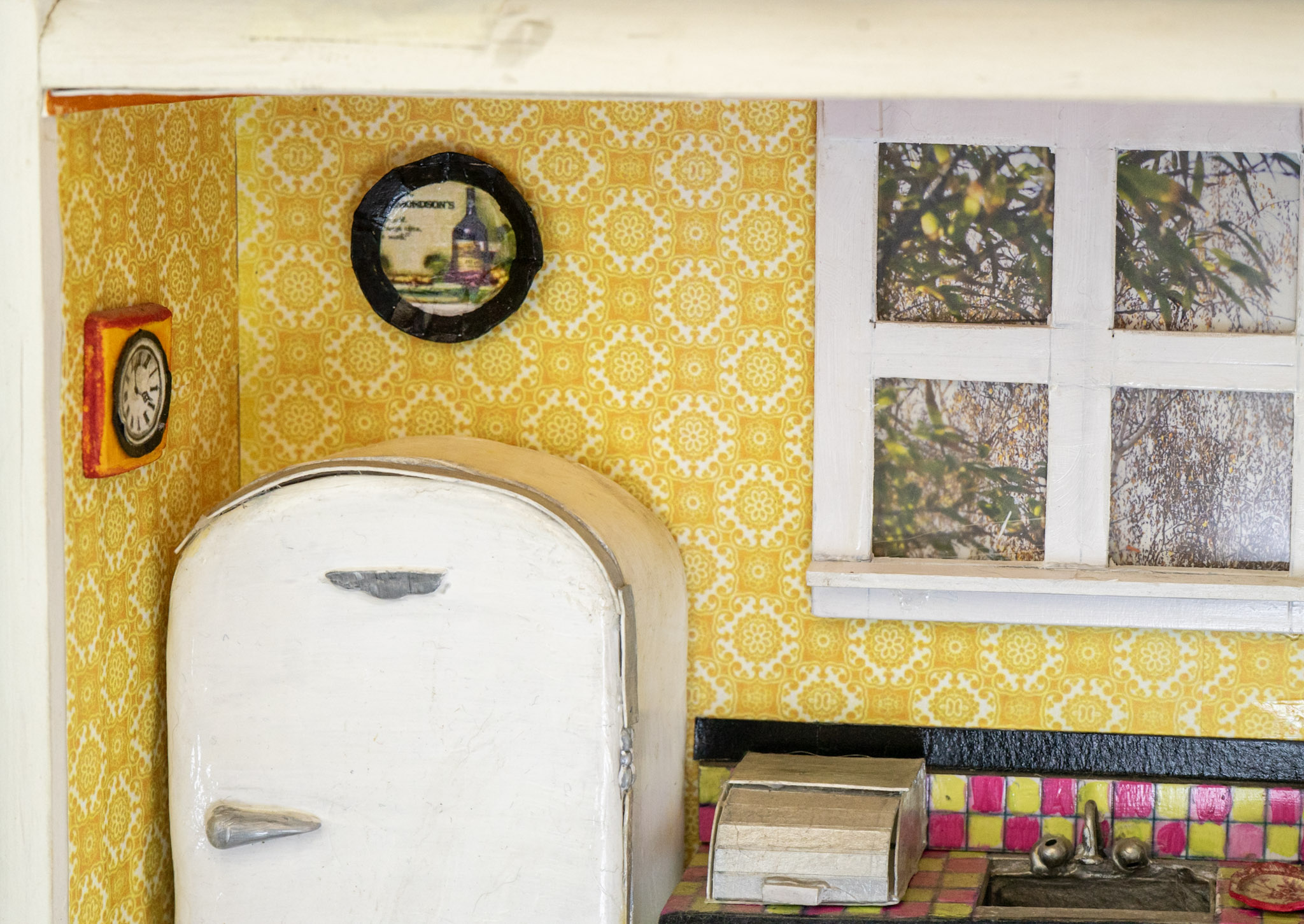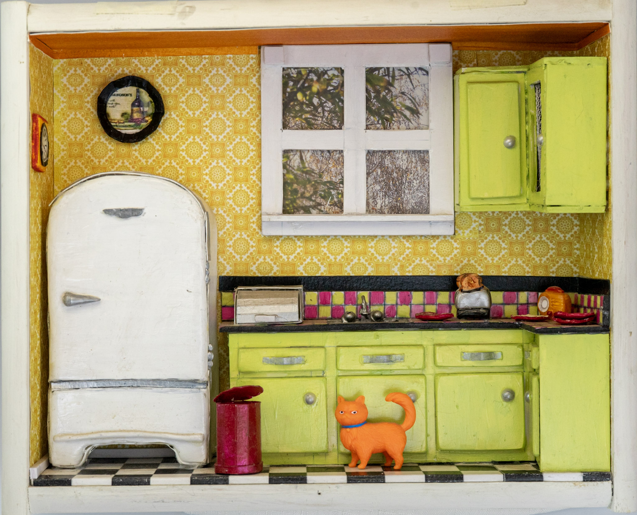 Este diorama artesanal rectangular revive la esencia de una acogedora cocina de los años 60s, cuidadosamente diseñado con un refrigerador clásico, mueble de cocina y múltiples detalles en tonos verdes que evocan la frescura y estilo de la época. Su puerta de vidrio protectora resguarda cada elemento, permitiendo disfrutar de la escena con nitidez y elegancia. Es una pieza ideal para regalar o para conservar como un recuerdo inmortalizado, aportando un aire de nostalgia retro y calidez hogareña a cualquier espacio.