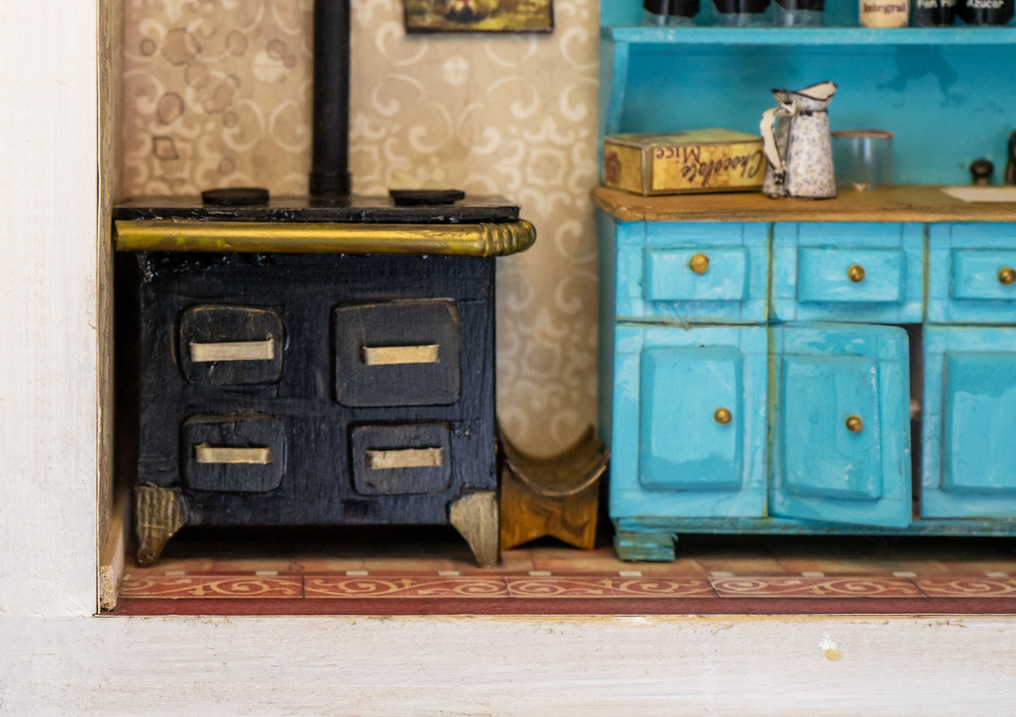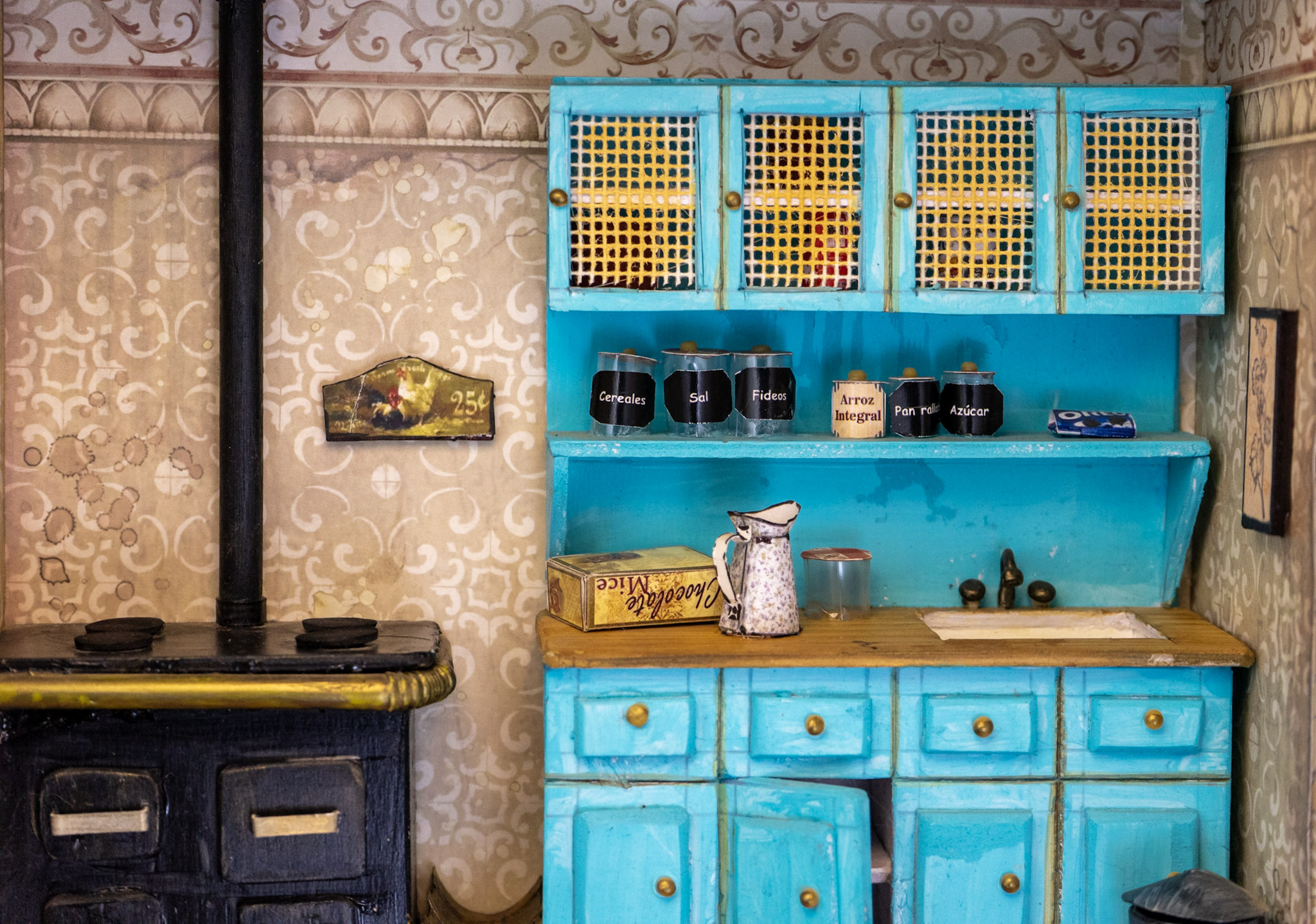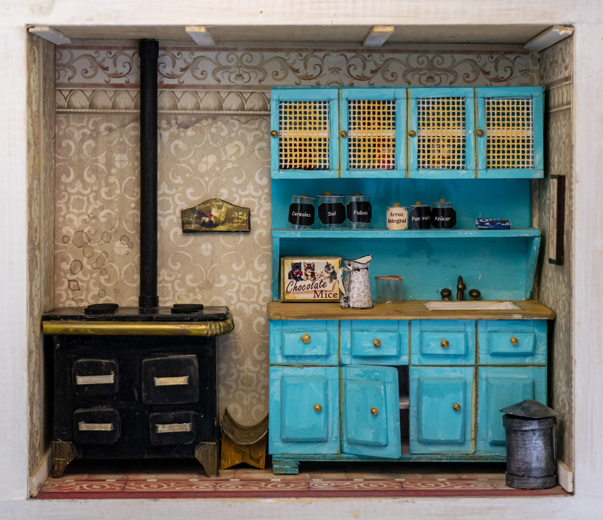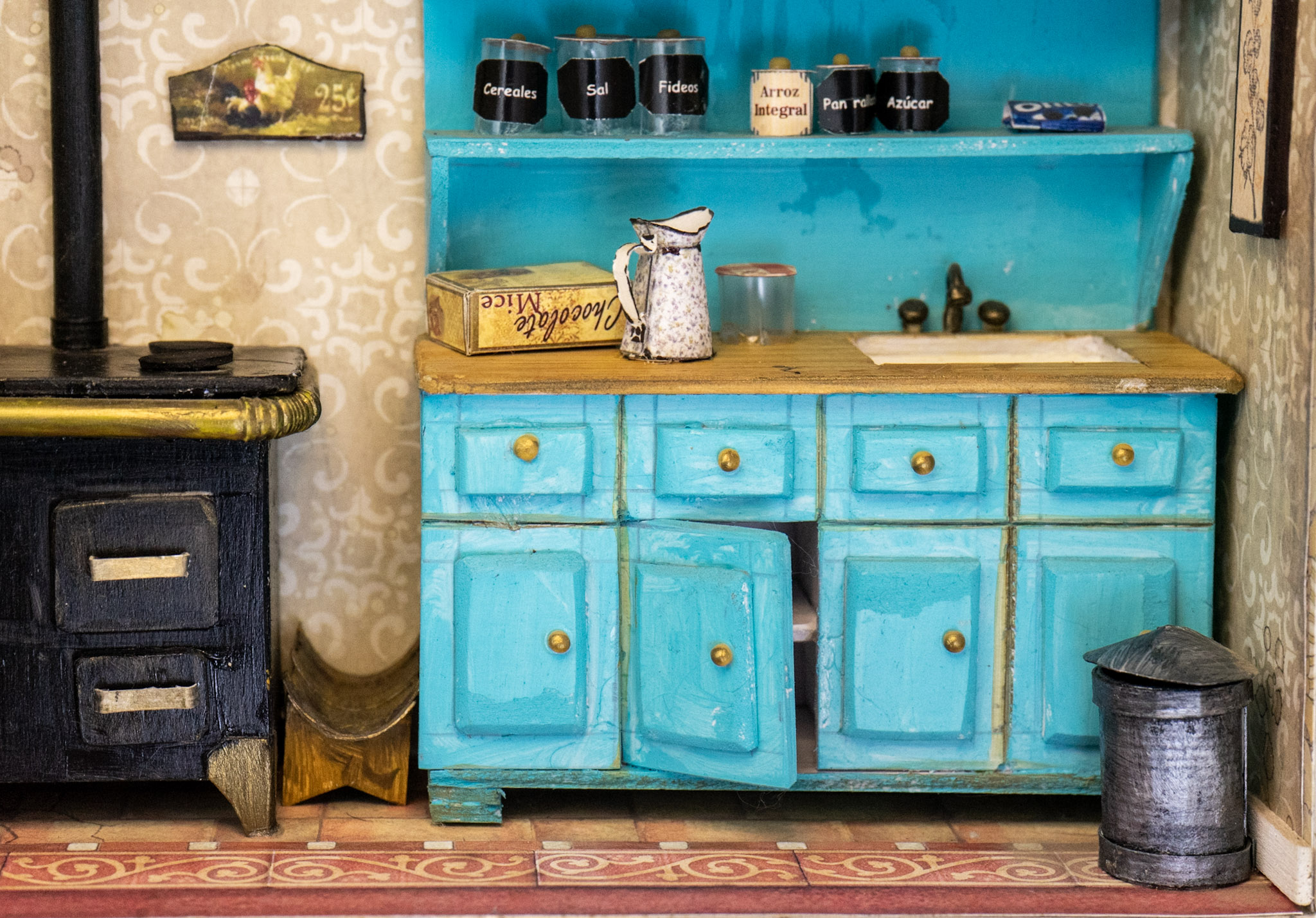Este diorama artesanal rectangular está inspirado en una acogedora cocina rústica, diseñada con una cocina colorida, cocina a leña y diversos detalles en tonos azules y café que evocan la calidez del hogar tradicional. Su puerta de vidrio protectora resguarda cada elemento, permitiendo apreciar el trabajo en miniatura con nitidez y encanto. Es una pieza ideal para regalar o para conservar como un recuerdo inmortalizado, aportando un aire de nostalgia y autenticidad a cualquier espacio.