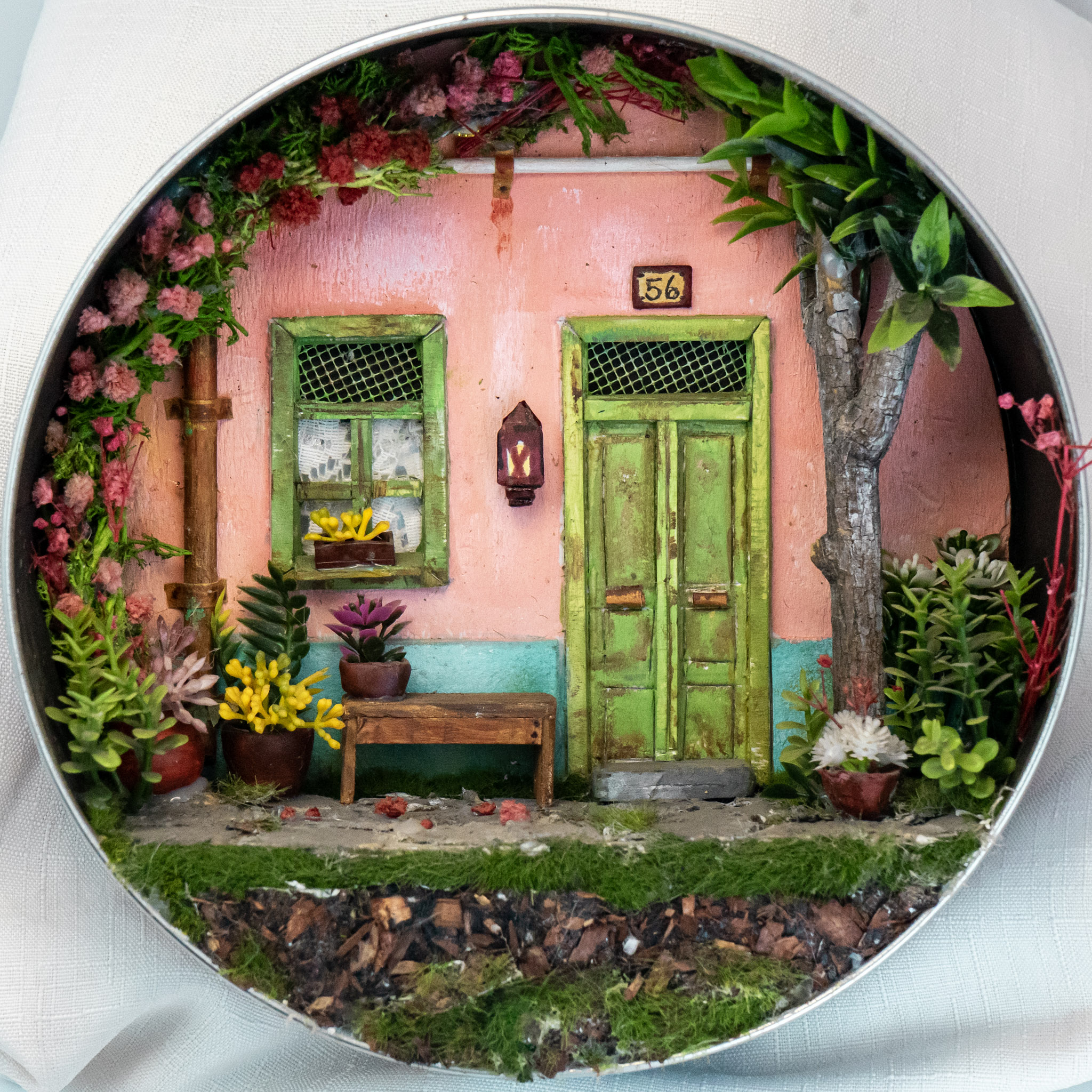 Este hermoso diorama circular artesanal, elaborado dentro de una caja de galletas, recrea una encantadora fachada de casa de estilo natural, acompañada de abundante vegetación y flores que transmiten frescura y calidez. Cada detalle está cuidadosamente trabajado a mano, convirtiéndolo en una pieza única y especial. Incluye tapa protectora, ideal para mantenerlo en perfecto estado. Perfecto como regalo original o como un adorno exclusivo que aporta un toque de naturaleza y encanto a cualquier espacio.