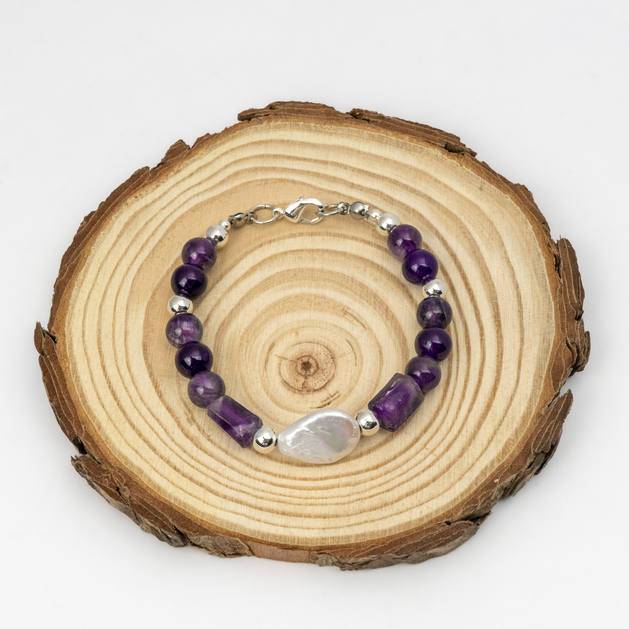 La amatista se combina con la perla barroca para formar una joya artesanal de refinada belleza. Los detalles enchapados en plata aportan brillo sutil, haciendo de esta pulsera una pieza elegante y espiritual, ideal para acompañar cualquier estilo.