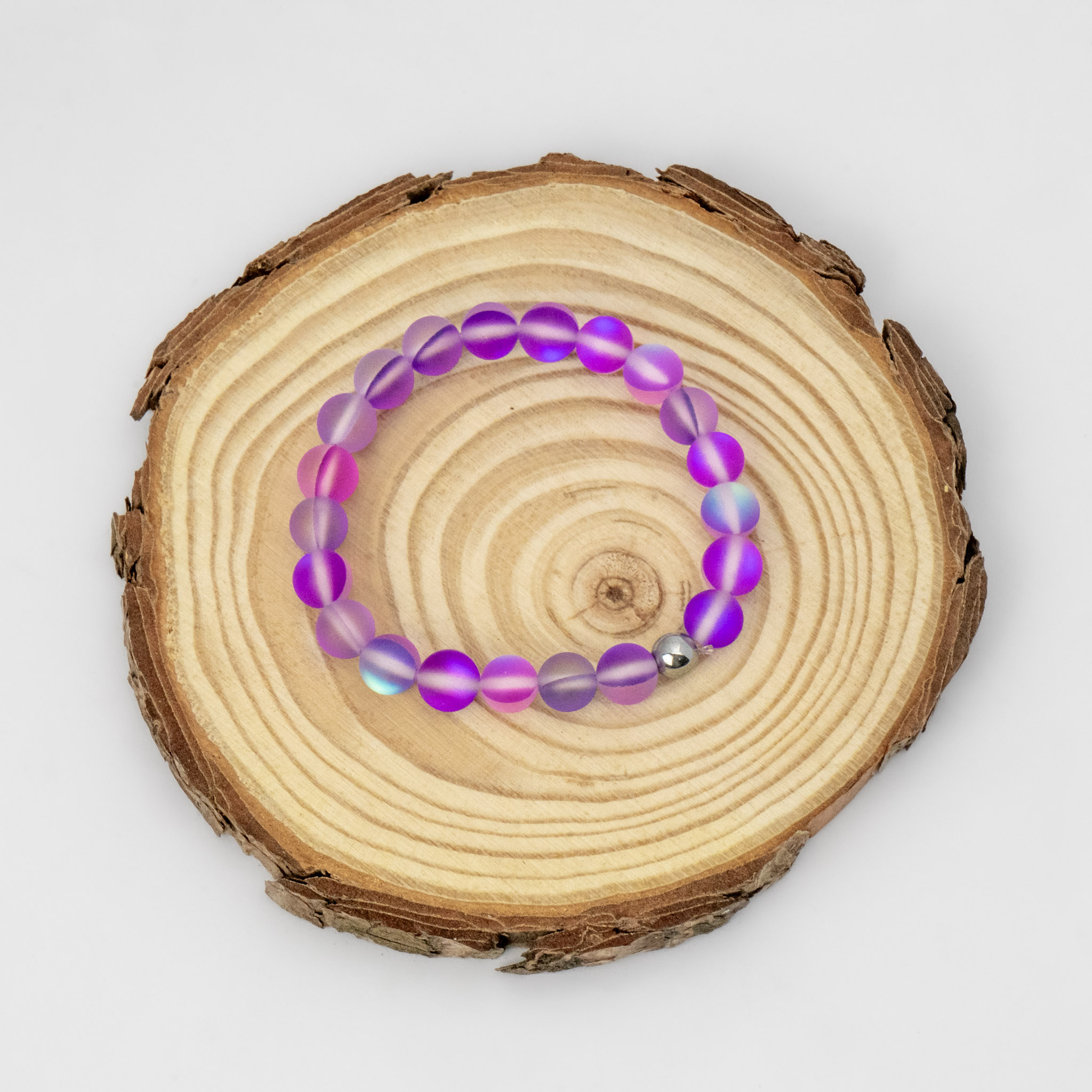 Un diseño mágico que combina cuarzo sirena en tonos tornasolados morados con hematita brillante. Su reflejo cambiante evoca el movimiento del agua y la luz. Una joya artesanal ideal para quienes aman lo original y encantador.