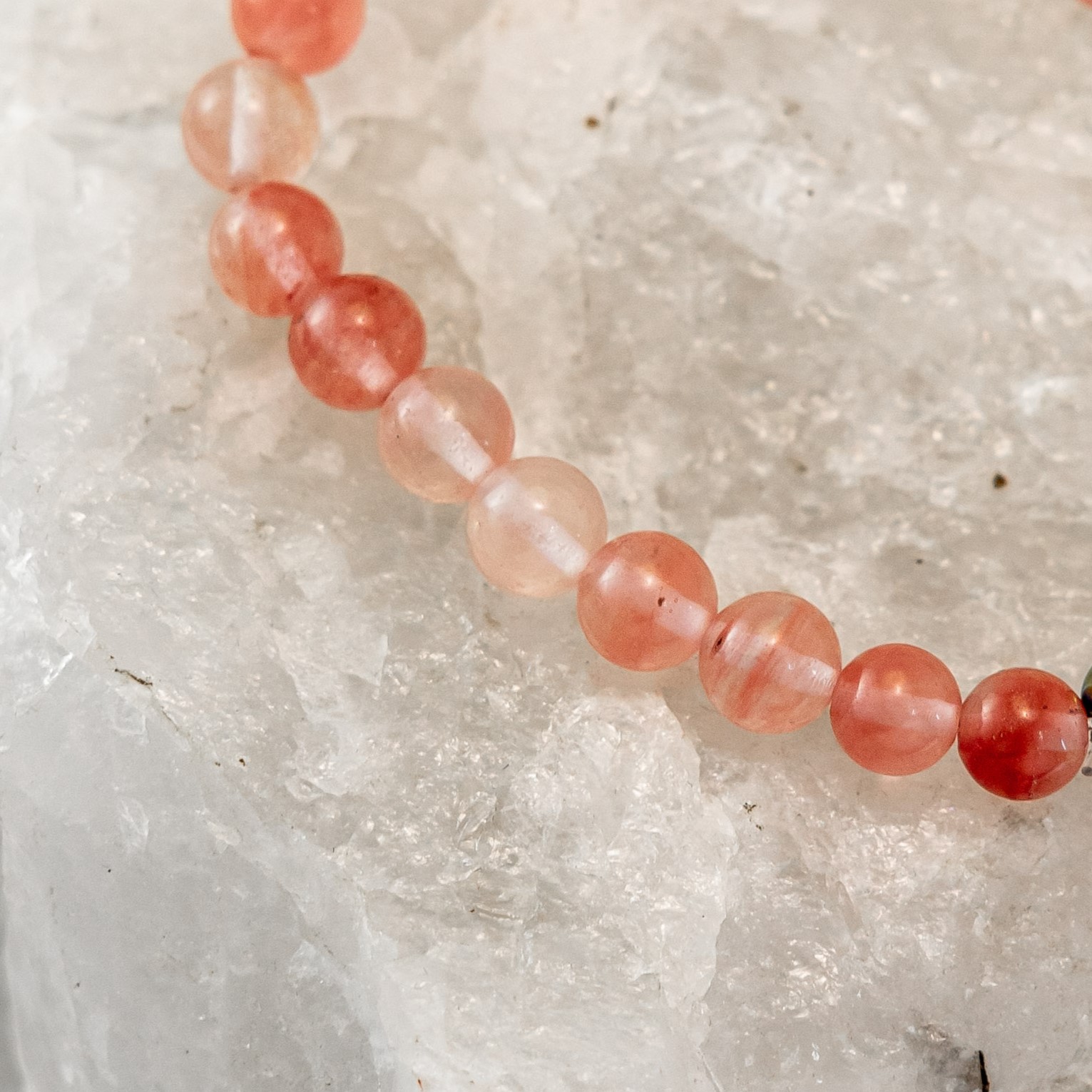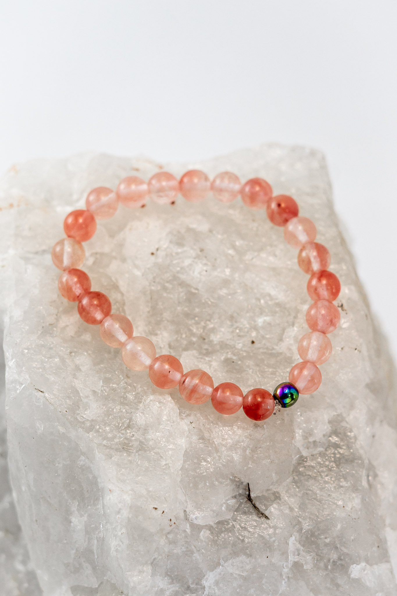 Esta pulsera elasticada está elaborada con cuarzo cherry, una piedra semitransparente en tonos rosados que aporta energía suave y femenina. Su diseño elástico garantiza un ajuste cómodo y versátil, perfecto para usar solo o combinado con otras pulseras. Ideal para quienes buscan un accesorio delicado y lleno de significado.
