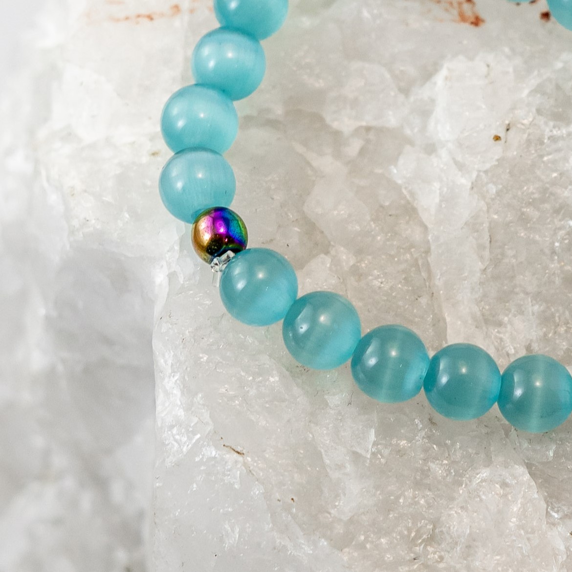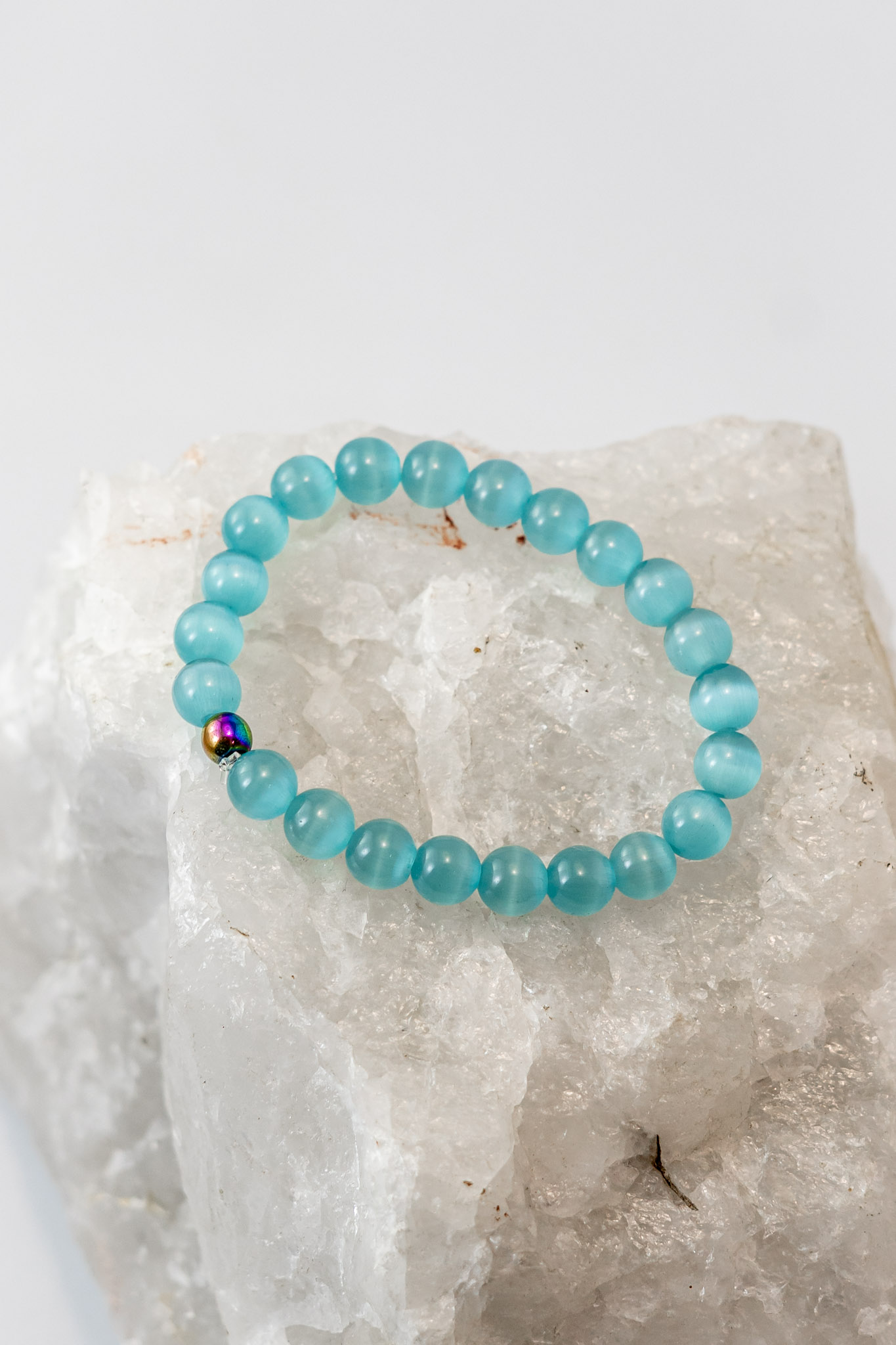 Esta pulsera elasticada está elaborada con ojo de tigre celeste, una piedra conocida por sus vibrantes tonos azules y sus propiedades energéticas de protección y claridad. Su diseño elástico permite un ajuste cómodo y versátil, ideal para usar sola o combinada con otras pulseras. Perfecta para quienes buscan un accesorio con estilo y significado.