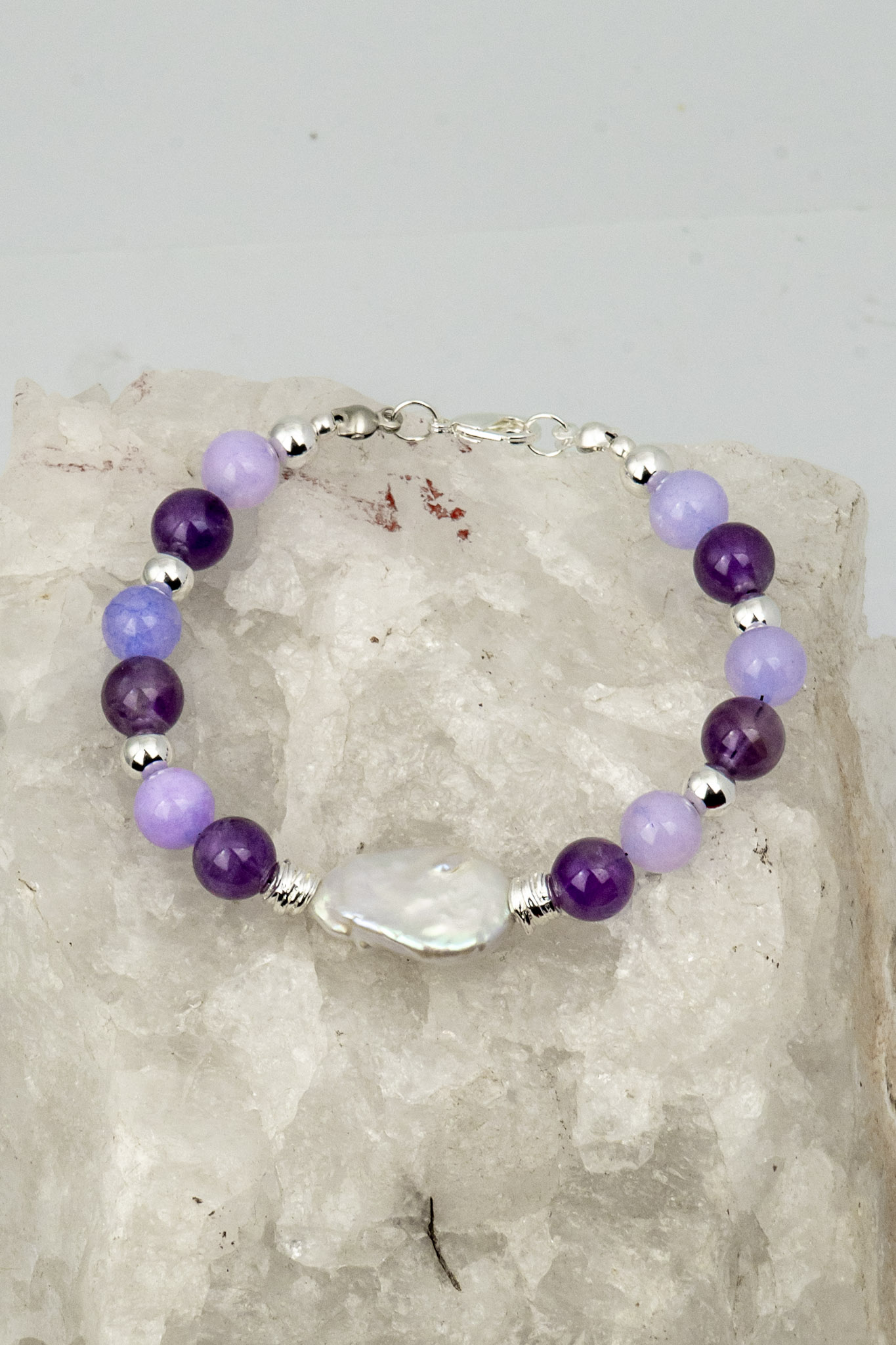 Pulsera elaborada con amatistas, ágatas lavanda y una piedra barroca central que aporta un toque distintivo y elegante. Los broches y separadores enchapados en plata complementan los tonos morados del diseño, creando una joya armónica y sofisticada, ideal para quienes buscan equilibrio y serenidad en sus accesorios.