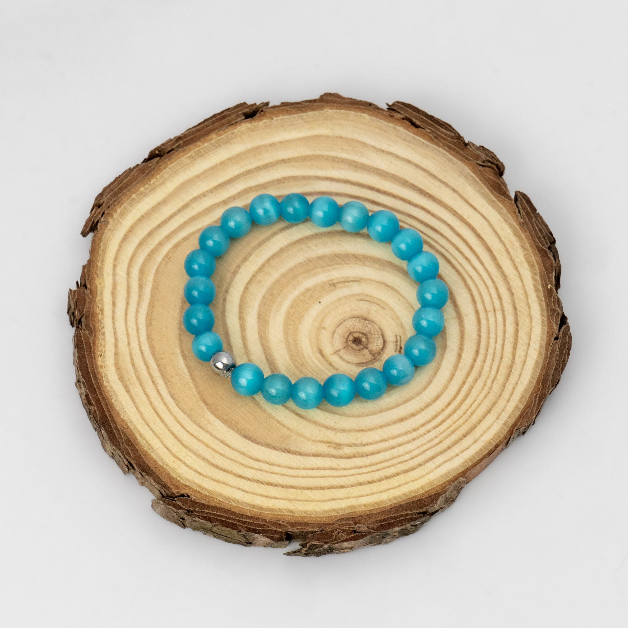 El tono inusual del ojo de tigre celeste se une al brillo metálico de la hematita, creando una pulsera contemporánea y energética. Una pieza artesanal que combina protección, serenidad y estilo moderno.
