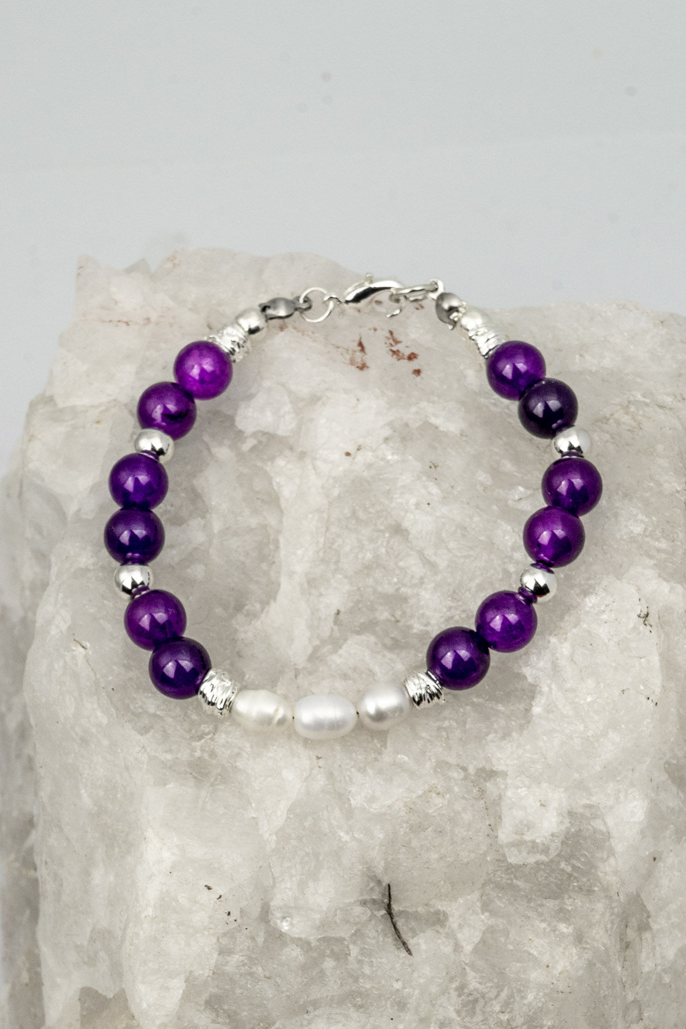Pulsera confeccionada con ojo de tigre fucsia y perlas de río, unidas mediante un hilo de acero que garantiza durabilidad y elegancia. Los broches y separadores enchapados en plata realzan el brillo de los tonos morado y fucsia, creando una pieza moderna y femenina, perfecta para destacar en cualquier ocasión.